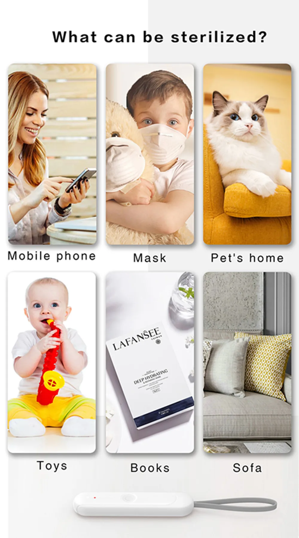 Описание продукта: Подходит для дома, офиса, деловой поездки, путешествий, легко носить с собой и использовать. Ультрафиолетовый светильник удаляет бактерии, покрывающие предметы домашнего обихода. Поддерживать чистоту в комнате, шкафу и домашних предметах. Избегайте попадания бактерий. Портативный дизайн экономит пространство и может быть стерилизован в любое время, устраняет до 99.9% бактерий. Простое управление, просто нажмите кнопку переключения для стерилизации. Он может питаться от подключения USB. Время использования: два часа в день. Параметры: Напряжение: 5V Мощность: 5 Вт Номинальный ток: 1A Вес: 150 г Цвет: белый