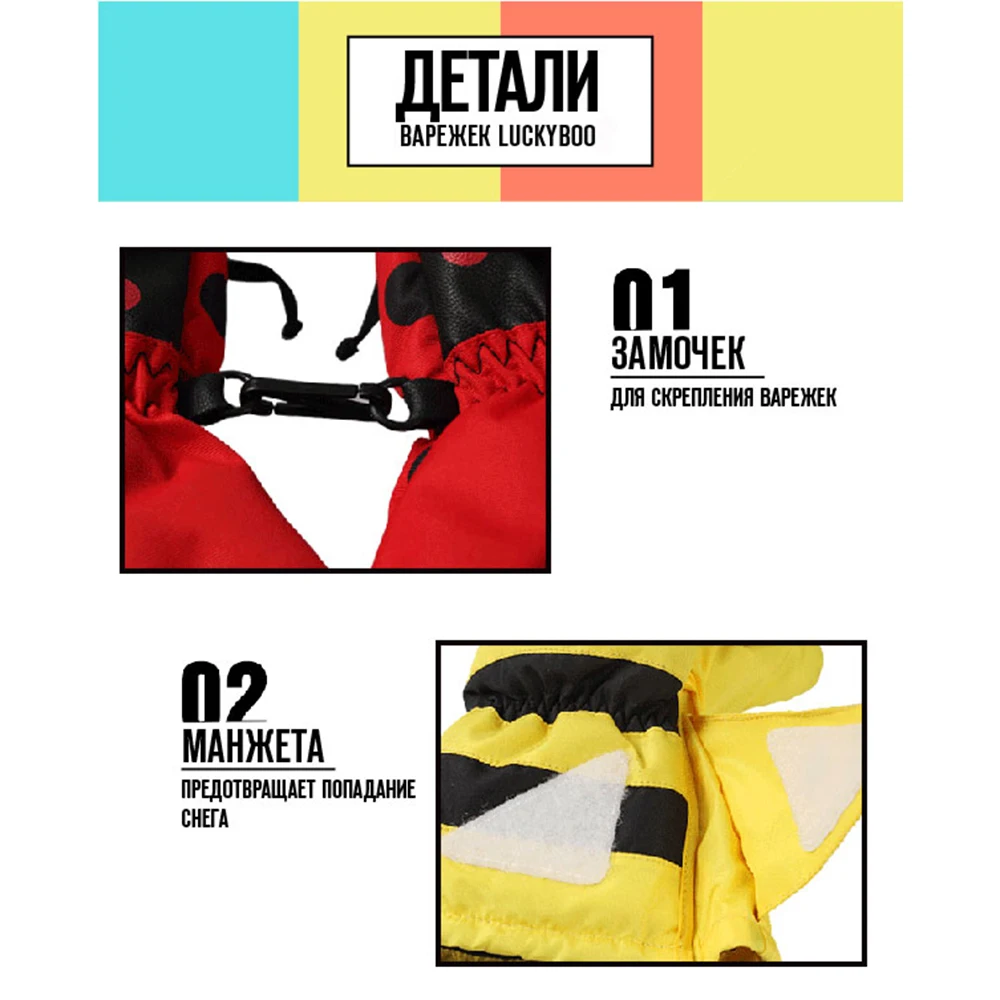 Бренд LUCKYBOO Тип Варежки для сноуборда и горных лыж Состав Нейлон 50%, полиуретан 50% Пол Унисекс Особенности модели Влагонепроницаемость Материал подкладки Флис Вид застежки Без застежки Размер S (4-6 лет), XS (2-4 года) Страна бренда Россия