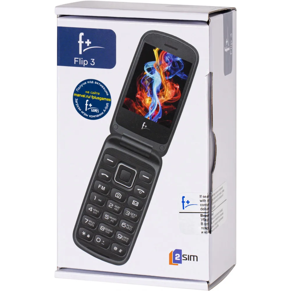 Телефон-раскладушка F+ Flip 3 сочетает компактность и простоту в использовании. Модель является продвинутой версией F+ Flip 3 , его преимущество — в большей емкости аккумулятора (1000 мАч). Это недорогой надежный телефон с хорошей камерой и понятным кнопочным управлением. Аппарат рассчитан на одновременную работу двух SIM-карт в режиме ожидания, на нем можно слушать музыку в формате MP3 и FM-радио. Благодаря крупным и удобным клавишам, большому экрану и надежной батарее Flip 3 — особенно подходящий раскладной телефон для пожилых людей.