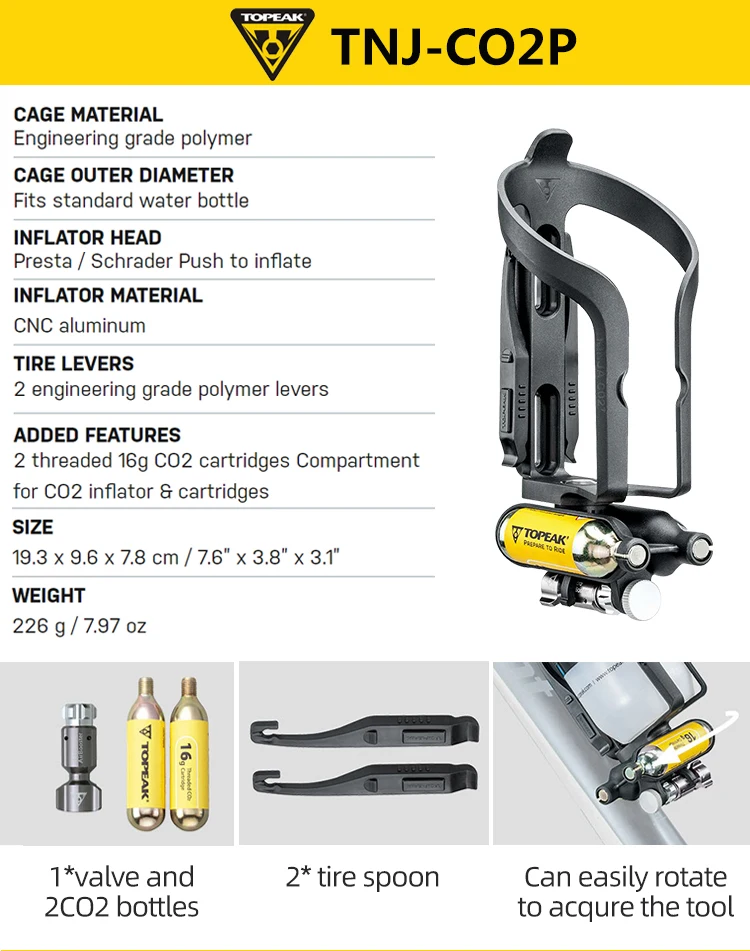 Материал клетки: инженерный полимер Внешний диаметр клетки: Подходит для стандартной бутылки для воды Головка накачки: Presta / Schrader нажмите, чтобы надуть Материал накачки: алюминий с ЧПУ Рычаги шин: 2 инженерных класса полимерные рычаги Дополнительные характеристики: 2 резьбовых 16 г СО2 картриджи отсек для СО2 накачки и картриджи Размеры: 19,3x9,6x7,8 см/7,6 "x 3,8" x 3,1» Вес: 226 г/7,97 унций 1 * клапан и 2CO2 бутылки 2 * ложка для шин Может легко вращаться, чтобы использовать инструмент
