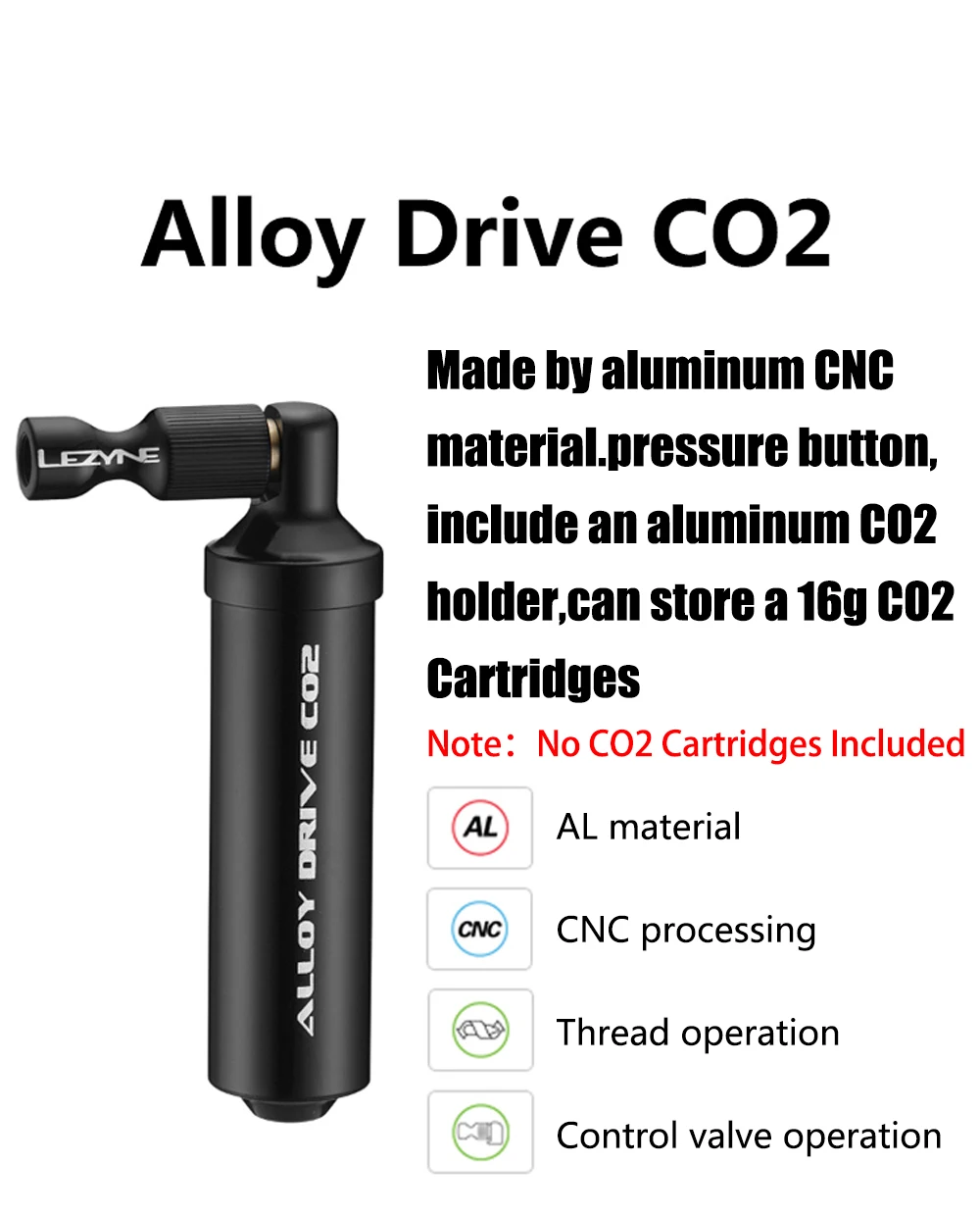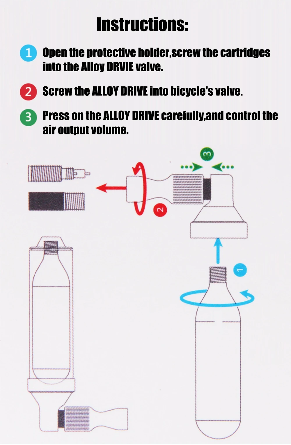 1. Откройте защитный держатель, вкрутите картриджи в клапан DRVIE из сплава. 2. Ввинтите сплав в клапан велосипеда. 3. Аккуратно нажмите на привод из сплава и Контролируйте объем выхода воздуха.