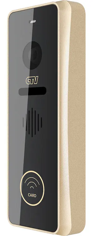 Вызывная панель для видеодомофона, корпус из алюминиевого сплава, передняя панель из стекла, сенсорное управление, две передних декоративных накладки в комплекте, встроенный считыватель Em-Marine, контроллер вых интерфейс Wiegand 26, подсветка кнопки вызова, 3 брелока, монт. уголок в комплекте, цв корп. шампань/графит/серебро.