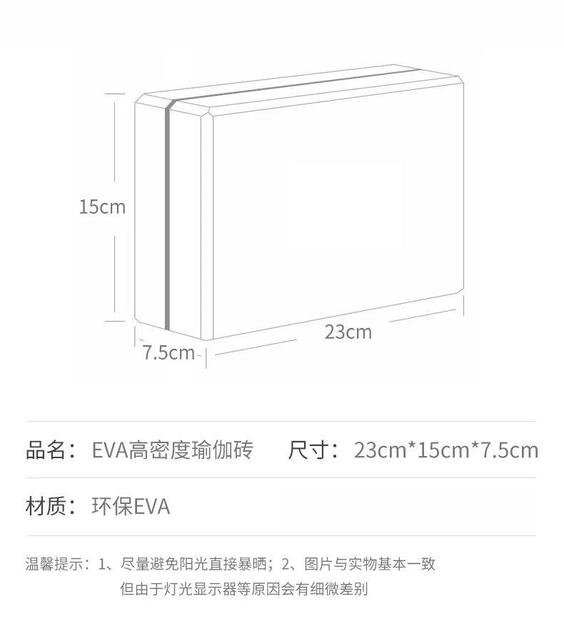 1. Название продукта: блок йоги EVA 2. Материал: ЭВА 3. Особенности: (1) блок йоги EVA Foam Block, инструмент для упражнений для семейного фитнеса (2) блок йоги является вспомогательным инструментом для начинающих и негибких практиков. (3) Это может помочь нам настроить наши жесты для выполнения некоторых движений. (4) помогает избежать натяжения части тела из-за вашей жесткости (5) этот инструмент принимает любую часть вашего тела в качестве растягивающего средства. Размеры: около 23x15x7.5cm