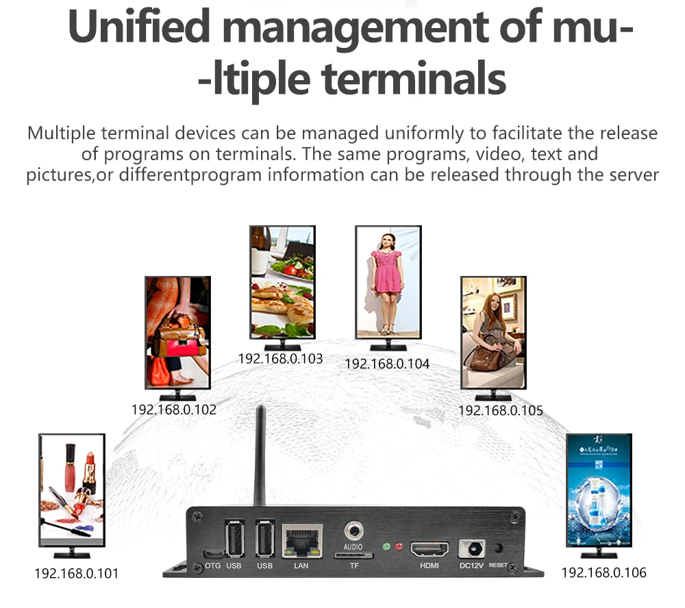 3) дисплей терминала: дисплей терминала в основном включает контроллеры, передатчики и различные Дисплейные устройства. Он принимает и выполняет мультимедийную информацию и элементы управления, контролируемые центром. Он автоматически транслируется в соответствии с расписанием через программное обеспечение терминала. Терминальный дисплей может создавать унифицированную информационную платформу на основе различных устройств отображения, таких как ЭЛТ-дисплеи, жидкокристаллические дисплеи, плазменные экраны, проекторы, сенсорные машины и все-в-одном.