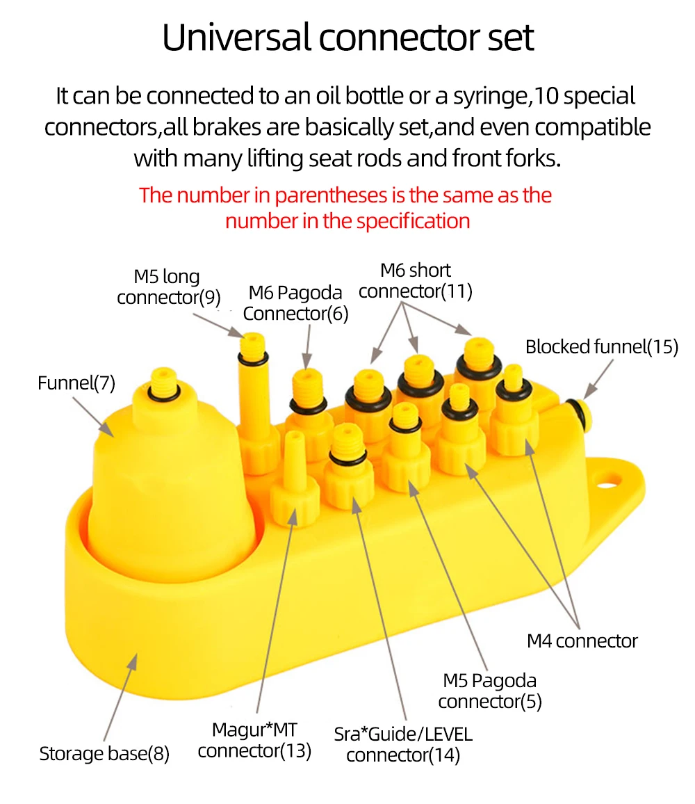 «Может быть подключен к бутылке с маслом или шприцу, 10 специальных Разъемы, все тормоза в основном установлены и даже совместимы С большим количеством подъемных седел и передних вилок." "Количество в скобках совпадает с номером В спецификации"