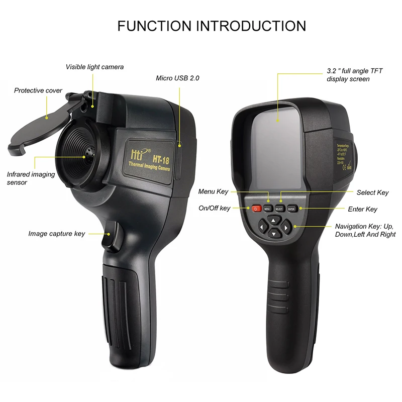 Спецификация: (HT-18)Дисплей экрана: 3,2 ''полноцветный экран Разрешение инфракрасного изображения: 220 × 160 Видимый Разрешающая способность изображения: 0,3 миллионов пикселей Тепловая чувствительность: 0,07 ° Диапазон измерения температуры: -20 ~ 300 °(-4 ° ~ 572 °) Точность измерения: ± 2,5 ° или ± 2.5% Охват длины волны: 8-14 мкм Угол поля/короткое фокусное расстояние: 27 ° × 35 °/0,5 м Излучательная способность: регулируется от 0,1 до 10,0 Режим фокусировки: фиксированный Частота захвата изображения: 8 Гц Вид опции: полный инфракрасный и полный обзор видимого изображения с 25% длиной шага Объем хранения: Встроенный 4G Формат изображения: JPG Источник питания: Встроенный заряжаемый аккумулятор 18650 USB: Micro USB2.0 Автоматическое выключение: 5 mintues/20 минут/не выключается автоматически Рабочая температура: от 0 до 50 ° Температура хранения: от-40 до 80 ° Влажность: <85RH