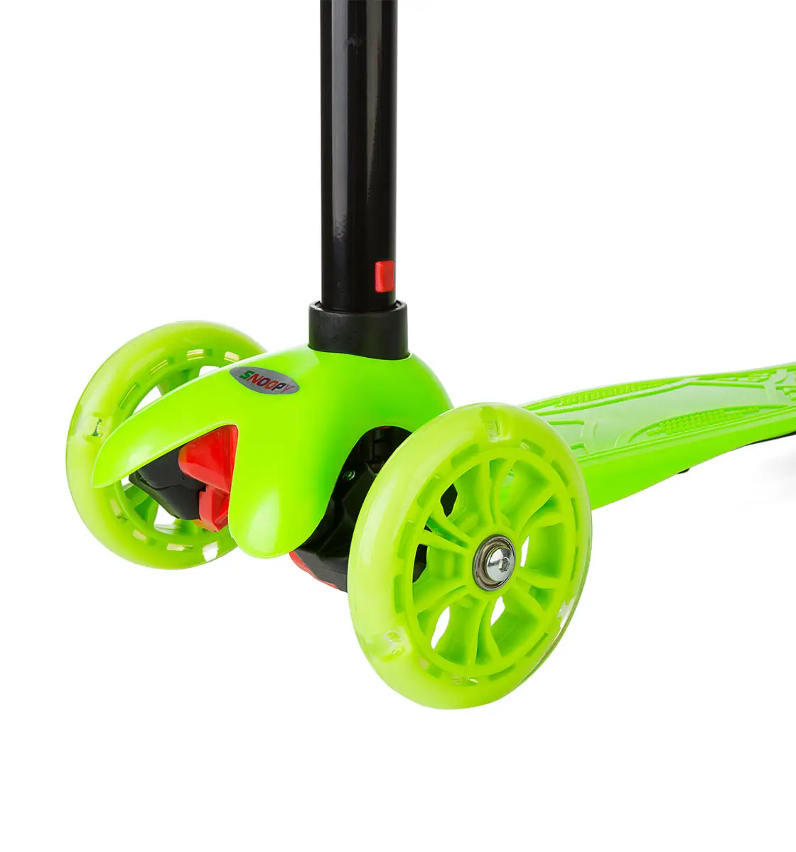 MaxCity SNOOPY – самокат с яркой подсветкой и интуитивным управлением, предназначенный для детей от 2 лет. Данная модель развивает координацию, помогает держать равновесие и баланс. Новаторская пружинная система позволяет совершать маневры, не поворачивая руль, а наклоняя его вправо и влево. Такой вариант более удобен и привычен для маленького ребенка. Благодаря трехколесной конструкции исключено заваливание набок даже во время резких поворотов; Телескопическая рулевая стойка регулируется под рост юного гонщика. Благодаря этому самокатом можно пользоваться не один год – он «растет» вместе с ребенком; Передние колеса диаметром 120 мм делают самокат проходимым, он с легкостью преодолевает небольшие неровности как на асфальтированной, так и на грунтовой дороге; Заднее колесо меньшего размера 80 мм предусмотрено, чтобы уменьшить дорожный просвет. Чем ниже платформа к земле, тем удобнее кататься на самокате – опорная нога не находится в постоянном напряжении, на ней не надо приседать, чтобы оттолкнуться; Надежные подшипники ABEC 5 не позволяют развивать опасную скорость; Кисти рук малыша будут надежно защищены мягкими наконечниками, расположенными на руле. А во время движения ограничители не позволят ладоням соскользнуть; За счет хромированного покрытия детали износоустойчивы и неприхотливы в эксплуатации; Для удобства хранения предусмотрена съемная ручка. Чтобы разобрать SNOOPY, необходимо нажать на кнопку, расположенную в нижней части рулевой стойки. Собрать самокат также элементарно – нужно просто вставить руль в «гнездо» до щелчка. MaxCity SNOOPY непременно понравится вашему ребенку за счет яркого веселого дизайна и колес со светодиодной подсветкой, которая зажигается во время движения.