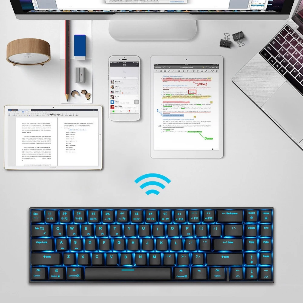 Беспроводная механическая клавиатура имеет светодиодный подсветку, что делает вашу клавиатуру крутой и стильной.