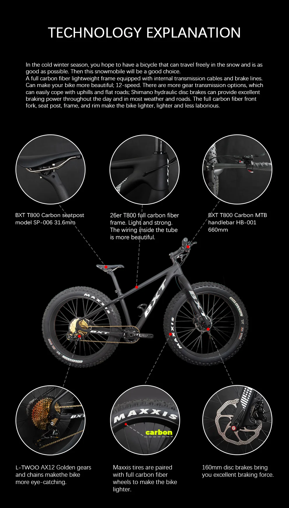 Комплект компонентов: L-TWOO AX 1*12 Размер шин: 26*4,8 Метод торможения: дисковый тормоз (160 мм) Цвет: можно подгонять Рама: BXT-Snow-078 карбоновая Снежная рама (размер 16 или размер 18)T800 углеродное волокно Вилка: BXT-FK-018 полностью углеродистая вилка для велосипеда Материал колес: полностью углеродное волокно Спицы: передние 32H задние 32H Шина: Maxxis 26er * 4,8 Передняя втулка: NOVATEC D201SB-15 герметичный подшипник Задняя Ступица: NOVATEC D202SB герметичный подшипник, ось из сплава Рычаги: L-TWOO SL-12A рычага переключения передач 1x12S Задний переключатель: L-TWOO RD-12-A задний переключатель 1x12S Коленчатый набор: Кривошип 36T / Peowheel кованый коготь 170 мм 1T Цепь: L-TWOO 12s Золото Кассета: L-TWOO 11-50T Задний и задний Дрейк: Shimano m355 Седло: BXT E-320 (микро волоконная кожа молибденовая сталь + Эва) Руль: BXT T800 углеродный MTB руль HB-001 660 мм Подседельный штырь: BXT T800 карбоновый Подседельный штырь модель SP-006 31,6 мм Стержень: алюминиевый сплав BXT + углеродный стержень 3k 90 мм Клетки для бутылок: BXT полностью углеродное волокно клетка для бутылок BXT-BC-001 Гарнитура: размер гарнитуры: 1-1/8 (41,8 мм) Down1-1/2(52 мм) Ручка: прорезиновая вставка