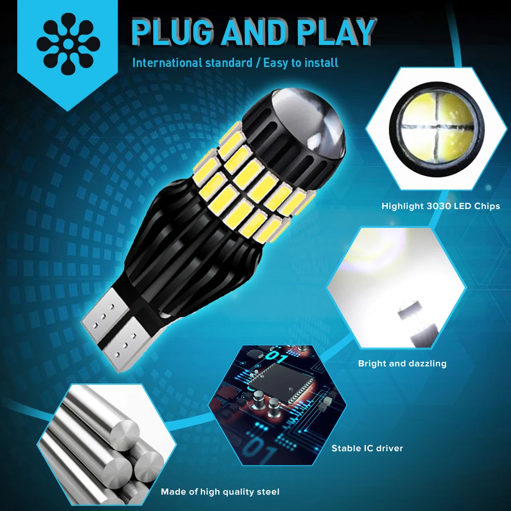Модель: Светодиодная лампа T15 920 921 912 W16W Размер фишек: подсветка 30 шт 4014 + 4 шт 3030 фишек Цвет светильник: белый/6000K Люмен: 1200 лм Срок службы: более 50000 часов Рабочее напряжение: 12 В-24 В Угол свечения: 360 градусов Назначение: может использоваться только для заднего хода автомобильных фар.