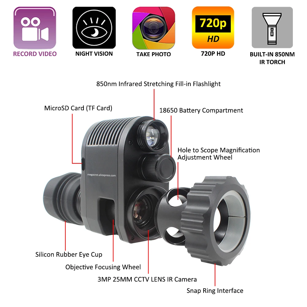 Мы являемся первым на рынке охотничьих прицел ночного видения DIY, который производит цифровой сигнал и устройство ночного видения с разрешением 720p HD. Другие продукты DIY на рынке имеют аналоговый сигнал, аналоговый сигнал означает снежинки на экране.