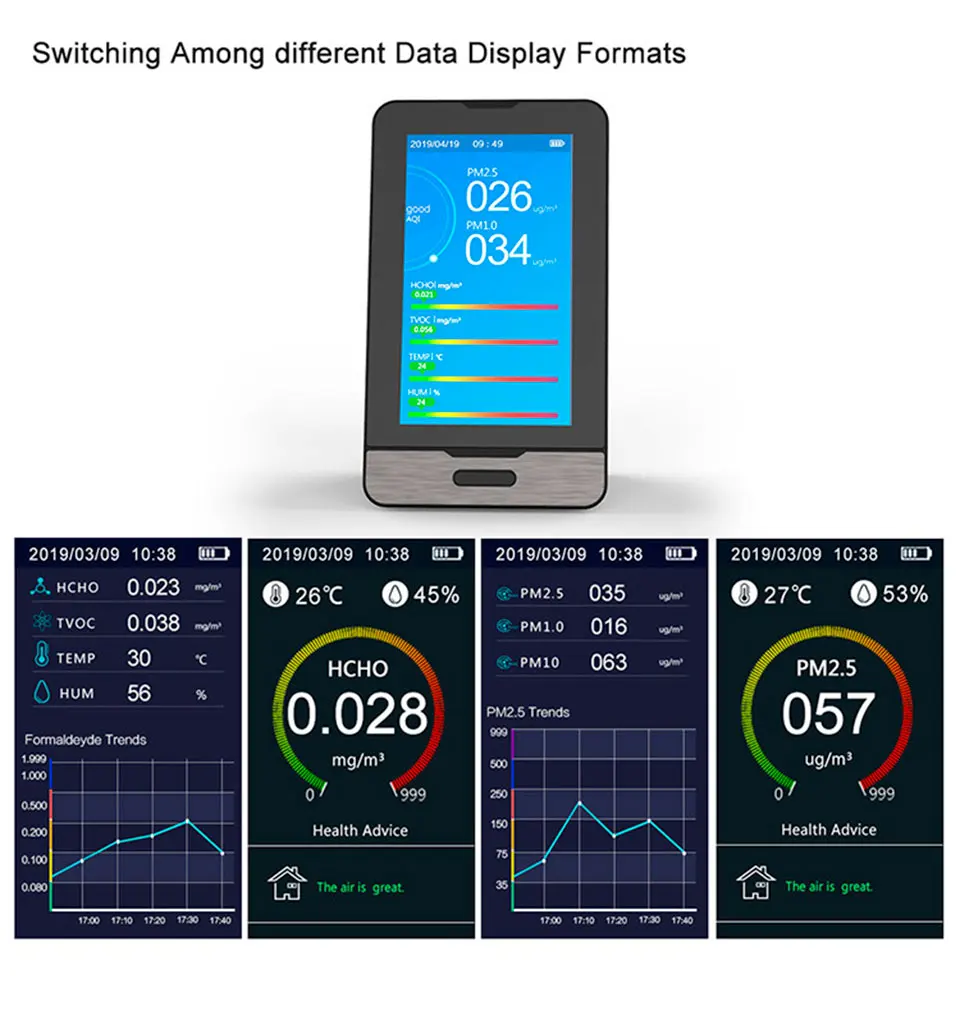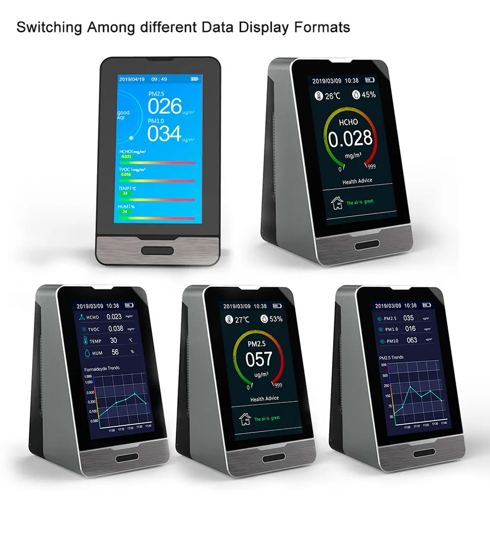 Этот продукт является многофункциональным монитором качества воздуха, который обнаруживает формальдегид (HCHO), общие летучие органические соединения (TVOC), твердые частицы <2,5 микрон частиц (PM2.5/1,0/10), температура, И влажности с часами и функцией записи. Как научное устройство для обнаружения качества воздуха, оно сочетает в себе несколько датчиков воздуха со встроенным вентилятором, что позволяет в режиме реального времени контролировать formalde-hyde (HCHO), общие летучие органические соединения (TVOC), PM2.5/1,0/10, температура и влажность на цифровом ЖК-дисплее.