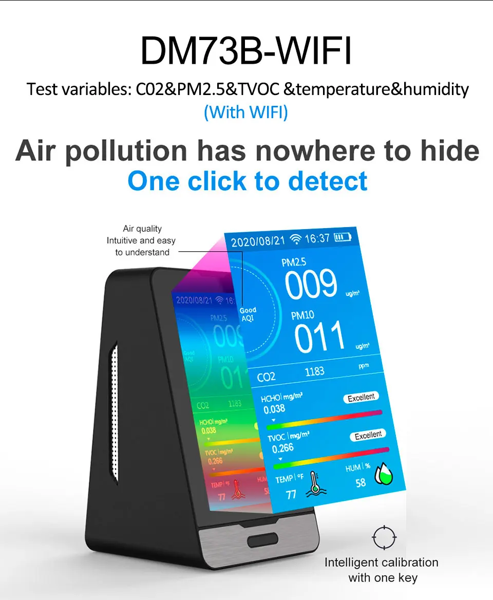 Этот продукт является многофункциональным монитором качества воздуха, который обнаруживает углекислый газ (CO2), формальдегид (HCHO), общие летучие органические соединения (TVOC), твердые частицы <2,5 микрон частиц (PM2.5/1,0/10), температура и влажность с часами и функцией записи. Как научное устройство для определения качества воздуха, оно сочетает в себе несколько датчиков воздуха со встроенным вентилятором, что позволяет в режиме реального времени контролировать углекислый газ (CO2), формальдегид (HCHO), общее количество летучих органических соединений (TVOC), PM2.5/1,0/10, температура и влажность на цифровом ЖК-дисплее.