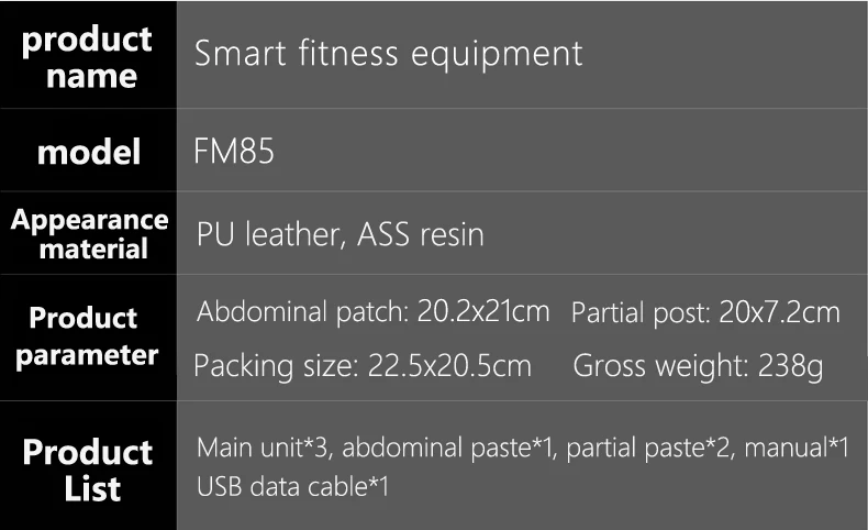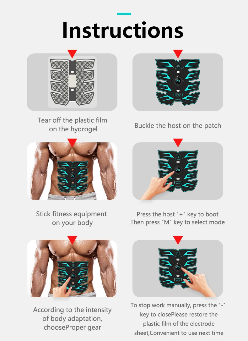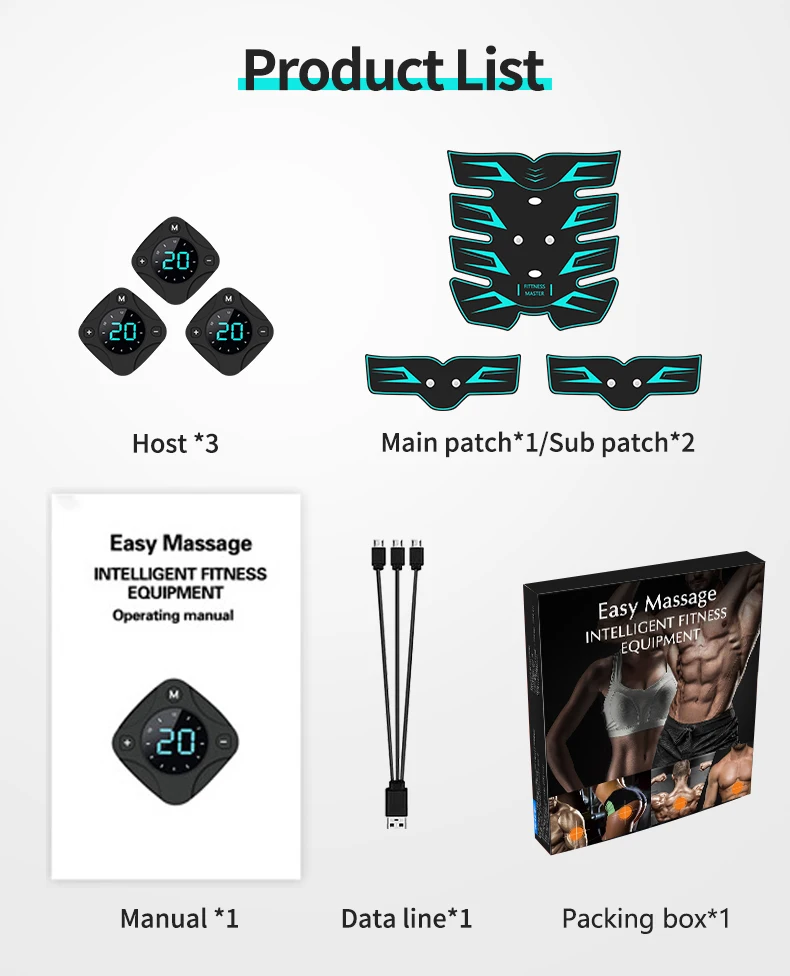 Описание продукции Основной материал корпуса: ПЭТ полимерный гель и ABS Подкладка: полиакриламид EMS устройства: перезаряжаемый Размер брюшной накладки: 20,2*21 см Повязка на руку: 19,6*7,1 см Вес брутто: 0,52 кг Чистая Вес: 0,4 кг Единицу продукции коробка Размеры: 20,5*22,5*3 см Режимы: 12 режимов и 20 интенсивностей Устройство: светодиодный экран Сертификат: CE/FCC,ROHS Зарядка: В тех случаях, когда он заряжается, красный индикатор светильник будет включен, В тех случаях, когда это полная мощность, индикатор будет выключен, Это займет около 1 часа для полной зарядки, можно использовать как минимум 100 минут. Посылка включает: 2 х подушечки для рук 1 x подушка на живот 3 x контроллер 1 х USB кабель для зарядки Руководство по эксплуатации-1 шт. Особенности: 1. Укрепляет и подтягивает мышцы 2. Электромагнитные импульсы помогают укрепить и определить ваше ядро с усилением мышечных сокращений 3. Простое управление нажатием кнопки с 6 режимами. 4. Технология электрической стимуляции мышц (EMS) 5. 1 день 1 раз, каждые 30 минут тренировок, упражнений и мышц. 6. Использование оригинального тренировочного импульса с частотой конкретного тока 7. Разработка метода тренировки эффективных мышц упражнений