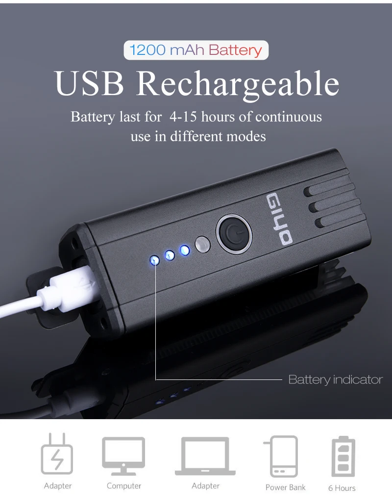 * USB-Перезаряжаемый-с литий-ионным аккумулятором большой емкости 1200 мАч, не нужно заменять аккумулятор, подходит для зарядки через все USB-порты. Время зарядки передсветильник велосипеда составляет около 2-3 часов,.