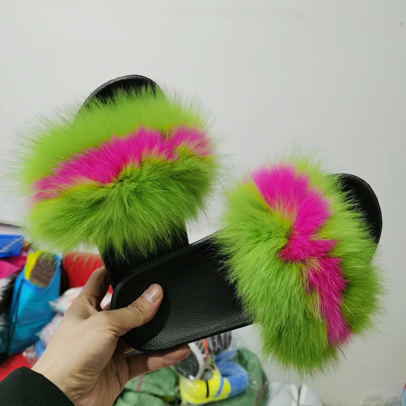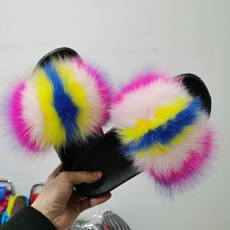Меховые тапочки; Оптовая продажа; Пушистые меховые шлепанцы для женщин; Сезон лето; Разноцветные радужные меховые тапочки; Дизайнерская обувь; Пляжные вьетнамки