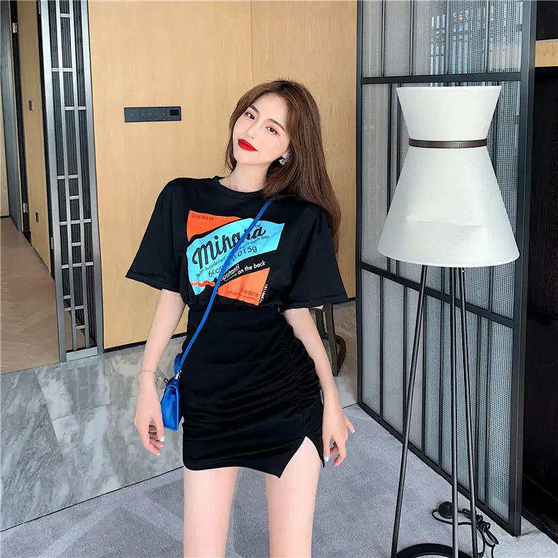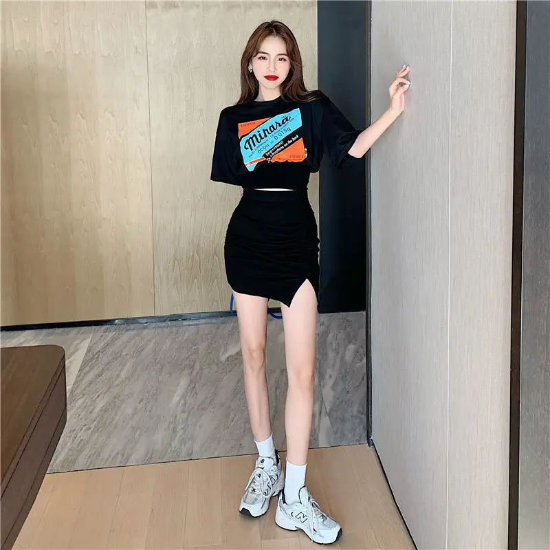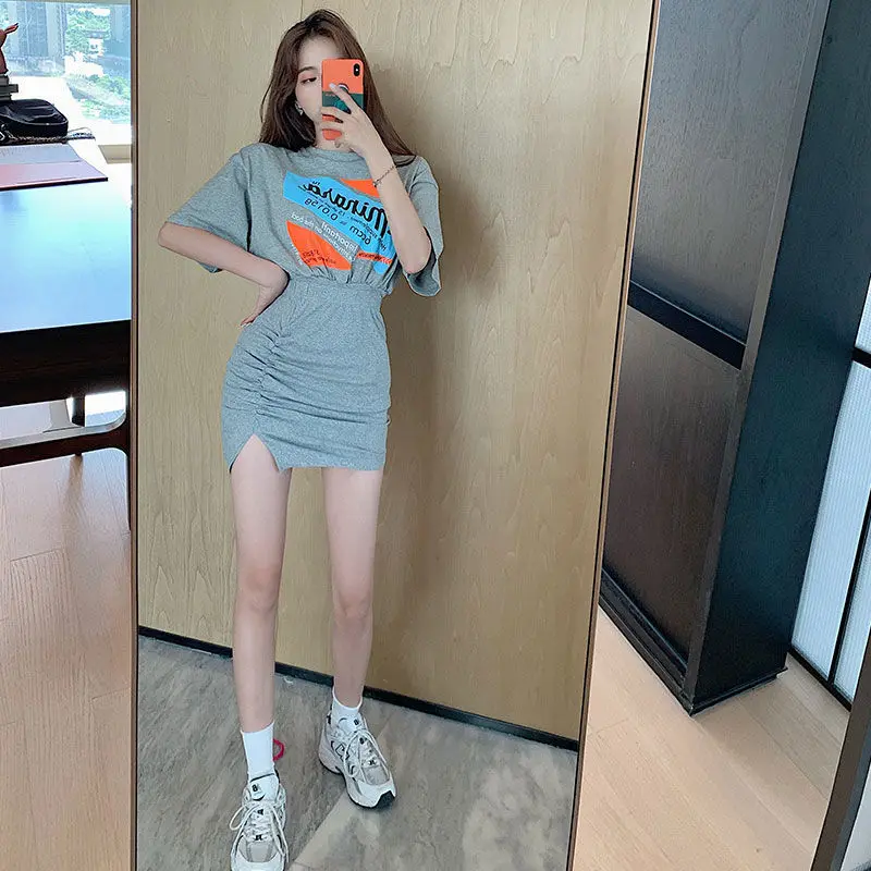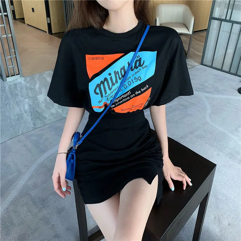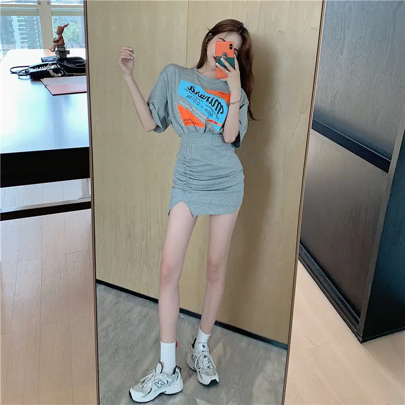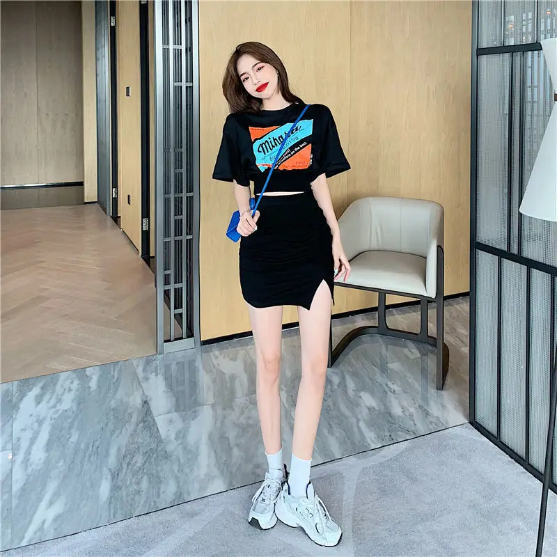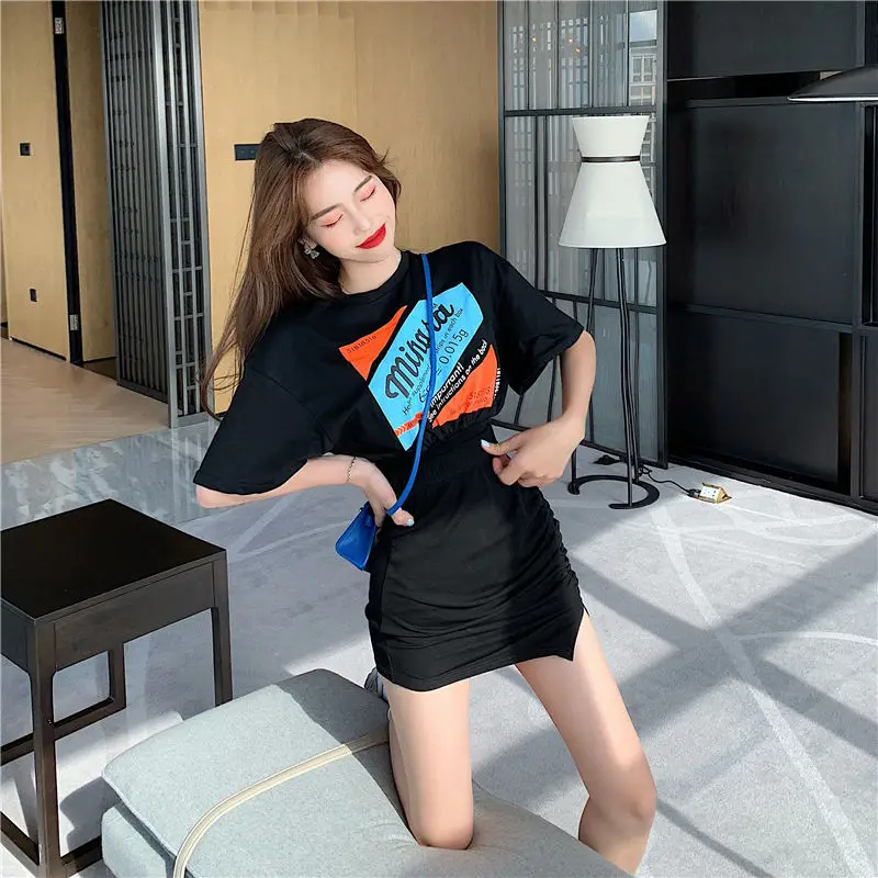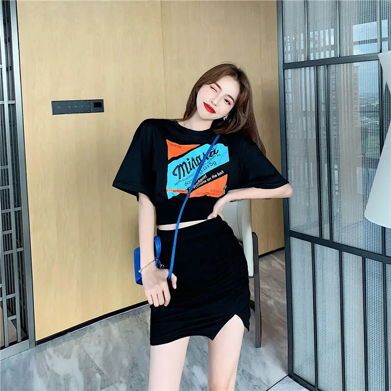 Комплект из футболки и платья с принтом, летняя юбка и топ женский комплект 2 шт. в стиле KPOP, короткие комплекты 2021, студенческий комплект из двух предметов с юбкой, юбка-плиссе