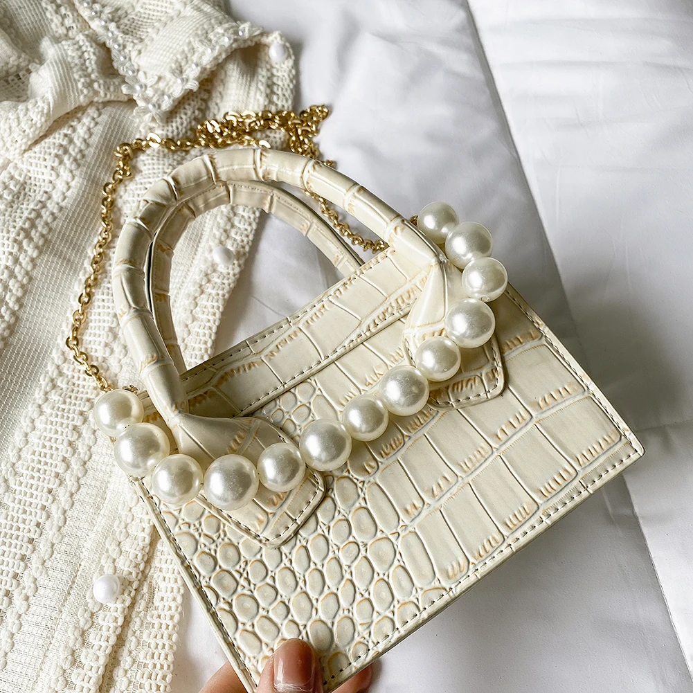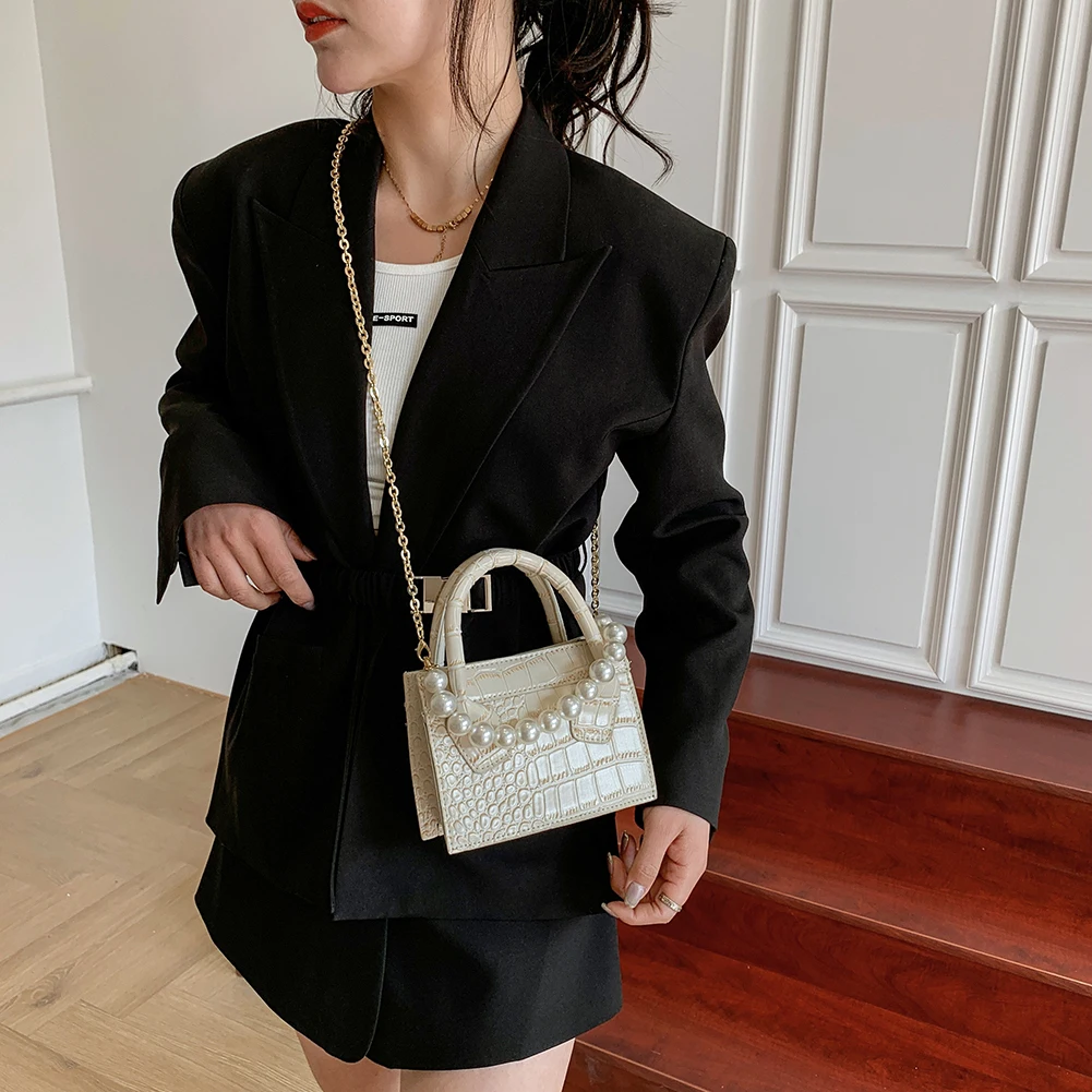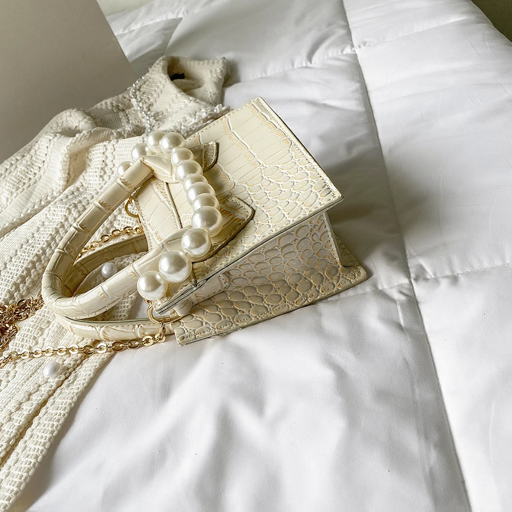 Модная женская сумка-мессенджер из искусственной кожи с узором аллигатора, однотонная сумка через плечо, повседневная женская сумочка с жемчужной цепочкой, маленькая сумочка с ручкой