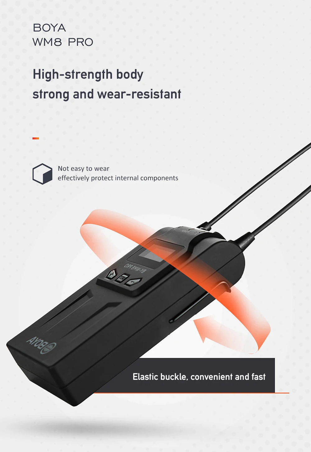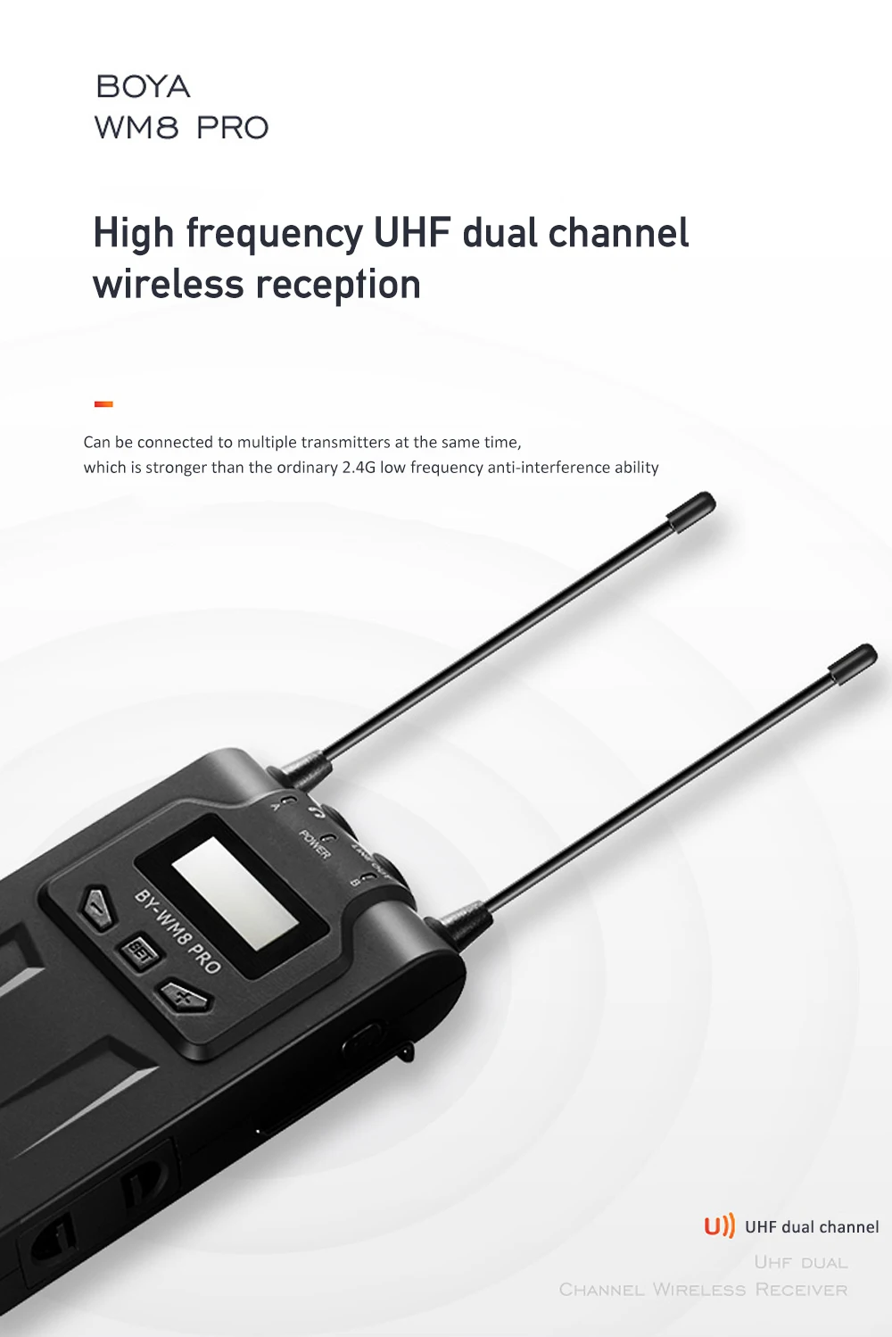 Pro-K2 BOYA BY-WM8 представляет собой обновленную двухканальную беспроводную микрофонную систему UHF для захвата аудио с двумя предметами, имеет простой в считывании ЖК-дисплей, широкий диапазон переключения частот RF, PLL-синтезированная Настройка и цифровая companying схема