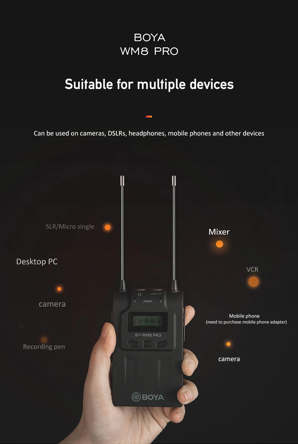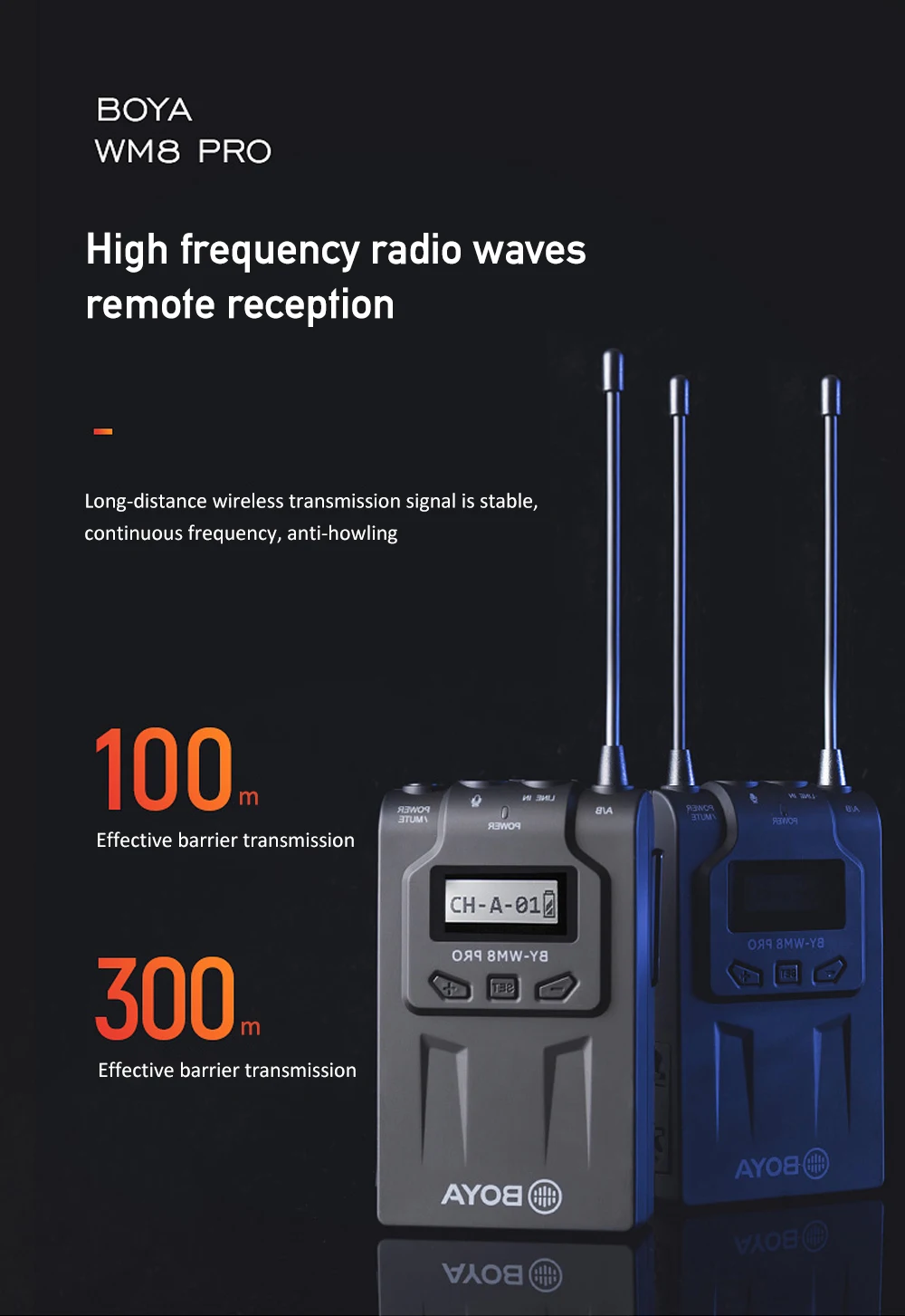 Pro-K1 BOYA BY-WM8 представляет собой обновленную двухканальную беспроводную микрофонную систему UHF для захвата аудио с двумя предметами, имеет простой в считывании ЖК-дисплей, широкий диапазон переключения частот RF, PLL-синтезированная Настройка и цифровая companying схема