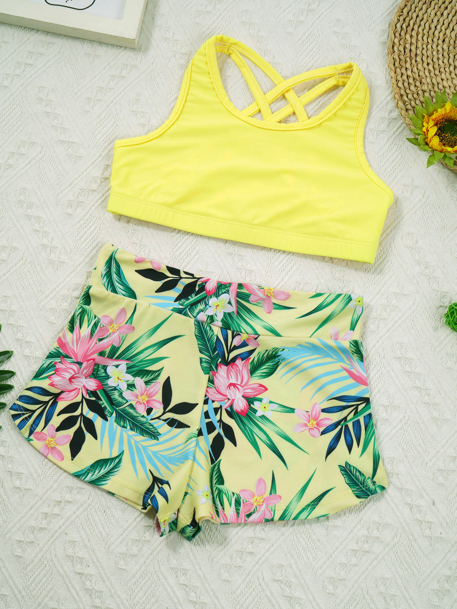 Комплект из 2 предметов для девочек: укороченный топ на бретельках с u-образным вырезом и перекрестными бретельками сзади, комплект с розовыми шортами с принтом лилии.