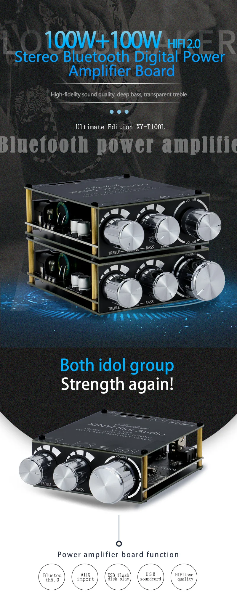 Название продукта: 100 Вт + 100 Вт Высокая и бас Регулируемая стерео Bluetooth Плата усилителя мощности