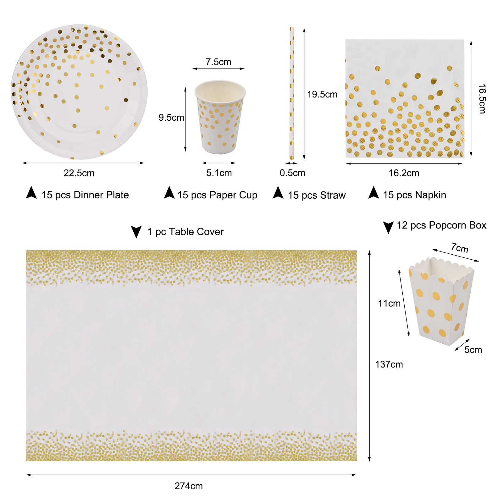Набор из 73 шт Бумажных Столовых приборов, включая 15 шт 9 унций стаканов, 15 шт 19,5 см бумажных соломинок и 15 шт 9 "тарелок, 15 шт салфеток, 12 коробок для попкорна и 1 настольное покрытие, которое достаточно для дней рождения, свадеб, юбилеев, детских душевых или других важных случаев.
