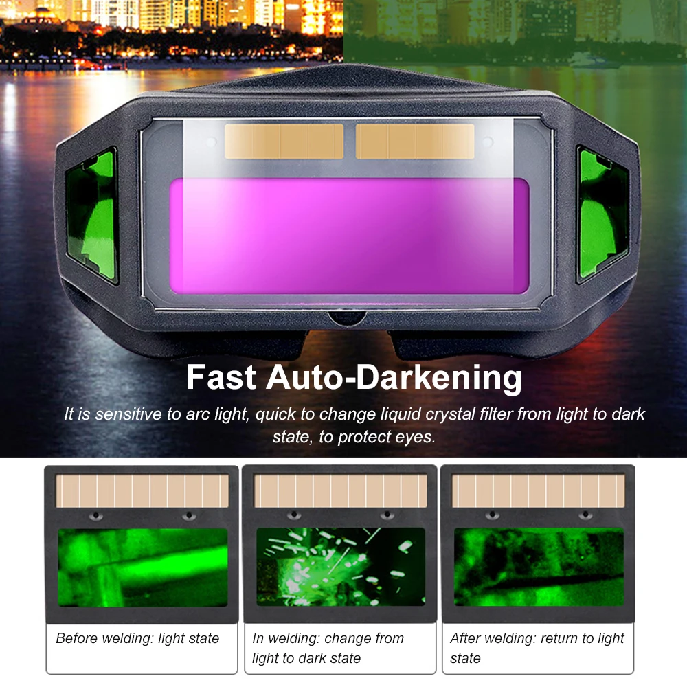 Сварочные очки, чувствительны к arc светильник, быстрый автоматический-темнеет (изменение жидкокристаллический фильтр из светильник в темное состояние) при сварке для защиты глаз, возвращается, чтобы светильник состояние при сварке прекращается.