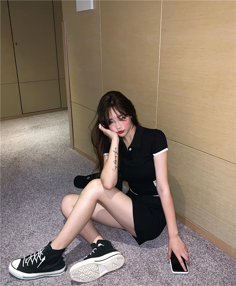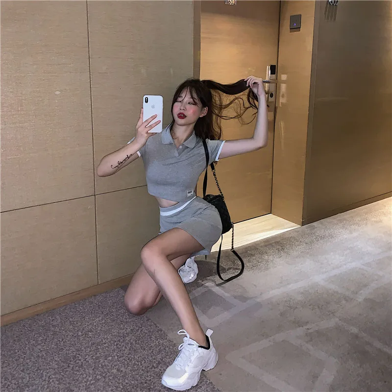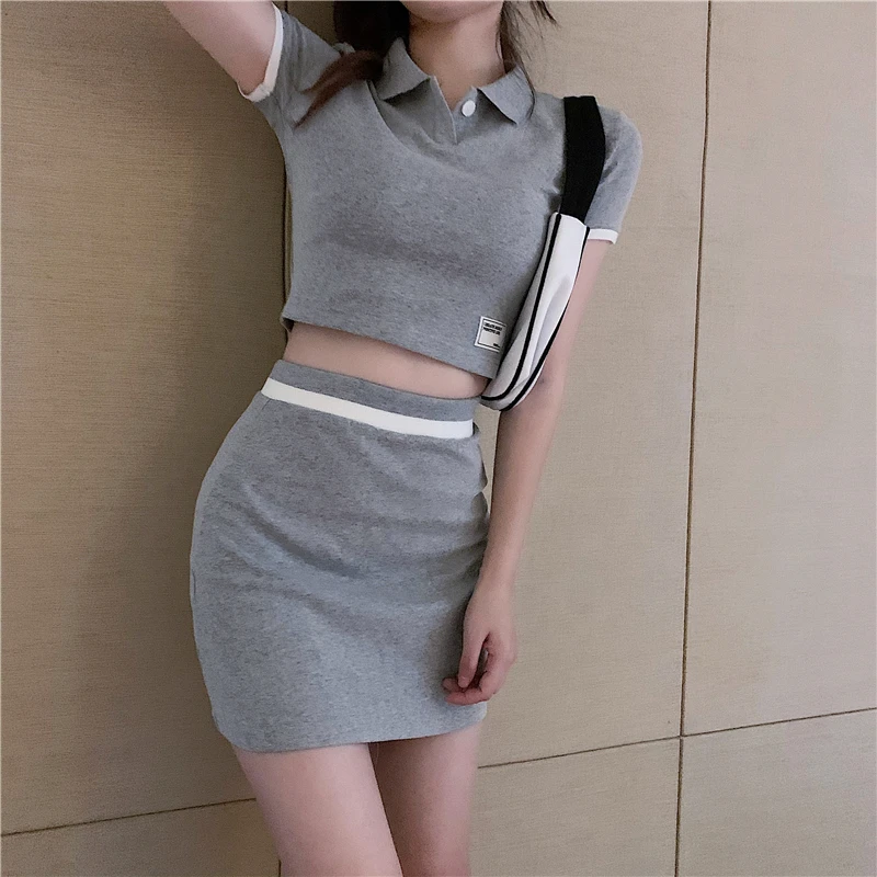 Комплект с футболкой с отворотами, платье, Спортивная Женский комплект 2 шт., Сплит, лето 2021, Короткие комплекты поло, однотонные юбки, студенческий комплект из двух предметов, юбка