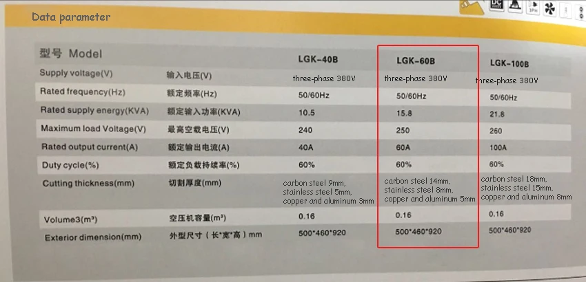 Плазменный резак трехфазный 380V 50/60Hz 15.8KVA 60A