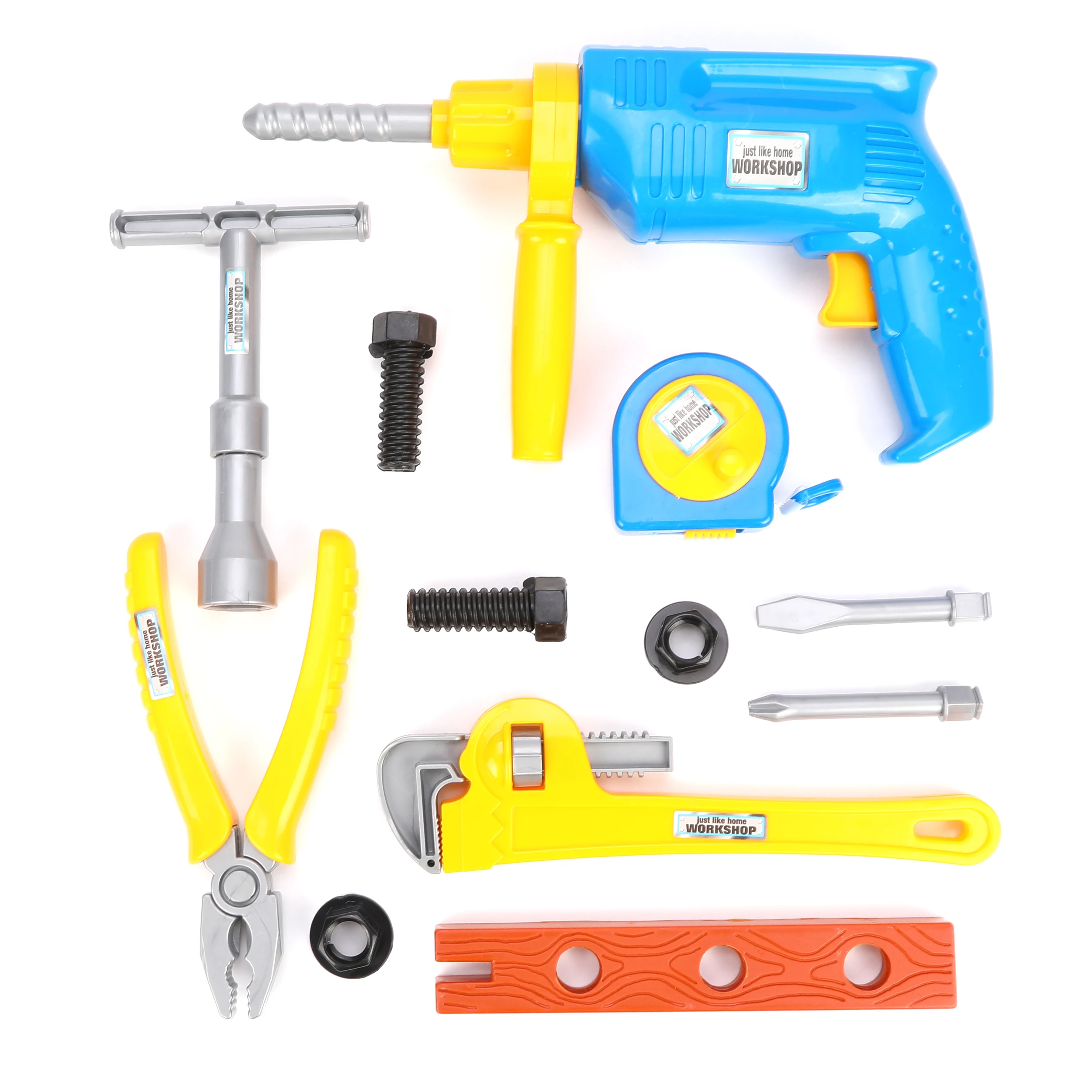 Набор игрушечных инструментов в ящике - отличный подарок для маленького подмастерья! Во время игры мальчик научится быть аккуратным, внимательным и хозяйственным. В комплект входят следующие игрушки: механическая дрель со сверлом, плоской и крестовой насадками, плоскогубцы, сантиметр-рулетка, струбцина, 2 болта, 2 гайки, Т-образный ключ и прямоугольный элемент, имитирующий древесину.