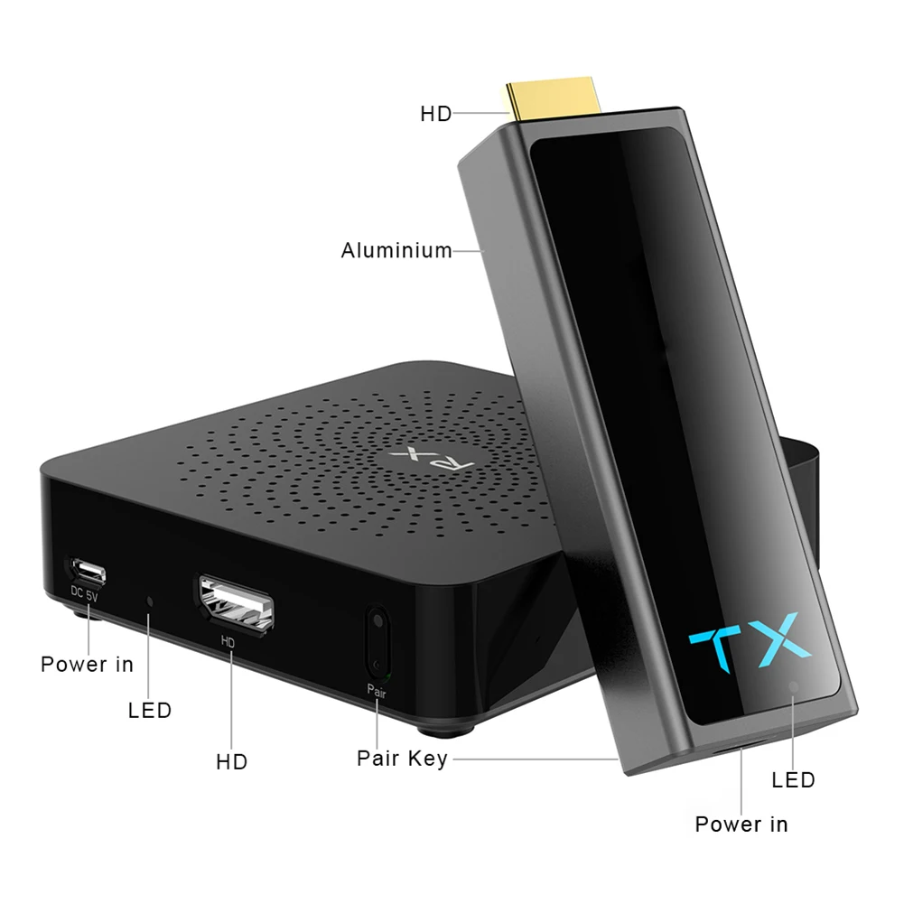 1. Подключите отправителя TX к ноутбуку или dvd-плееру: Подключите коробку TX и dvd-плеер с помощью кабеля, совместимого с HDMI, И используйте шнур питания USB для питания коробки TX (вы можете получить питание от адаптера питания USB или usb-порта телевизора), Индикатор светильник из TX коробка медленно мигает после включения питания.