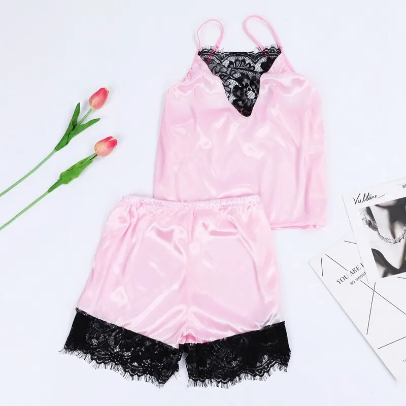 Сексуальные женские кружевные пижамные комплекты, 2020, без рукавов, на бретельках, пижамы, 2 шт., с отделкой, Атласный топ на бретельках, ночное белье, ночные рубашки, нижнее белье, пижама Mujer
