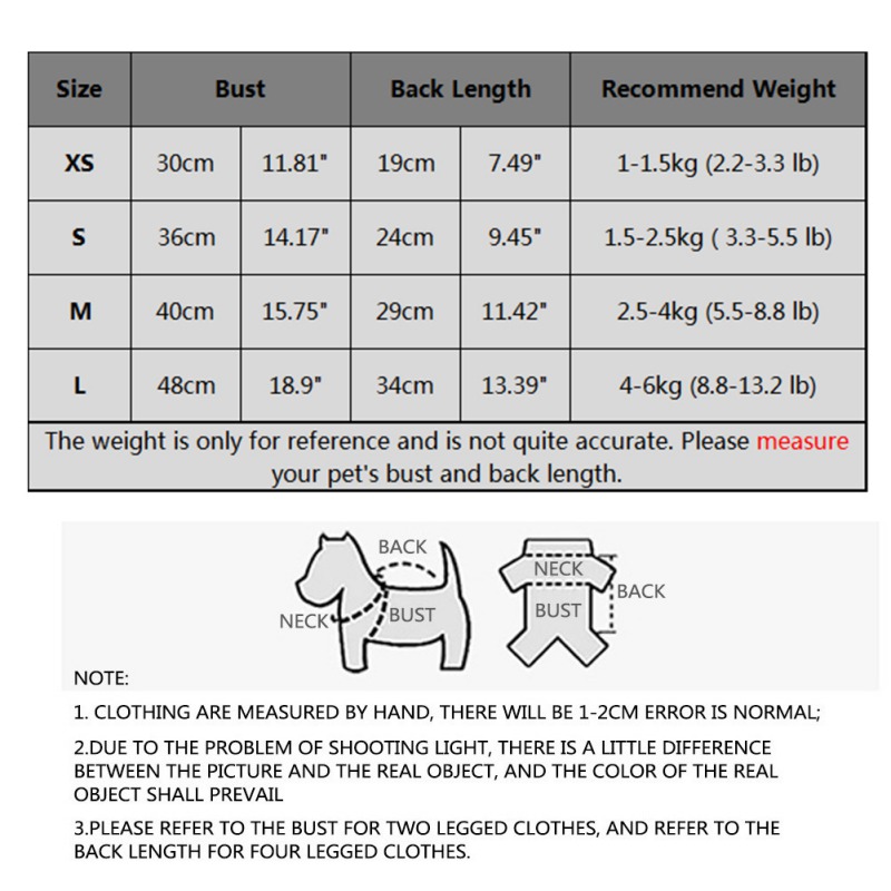 Пожалуйста, измерьте обхват груди вашего питомца и длину спины перед заказом. Если ваш измеренный Размер собаки находится между двумя размерами-выберите больший размер!