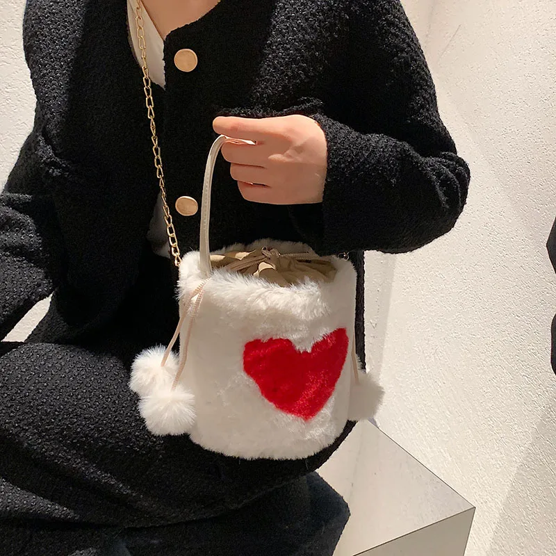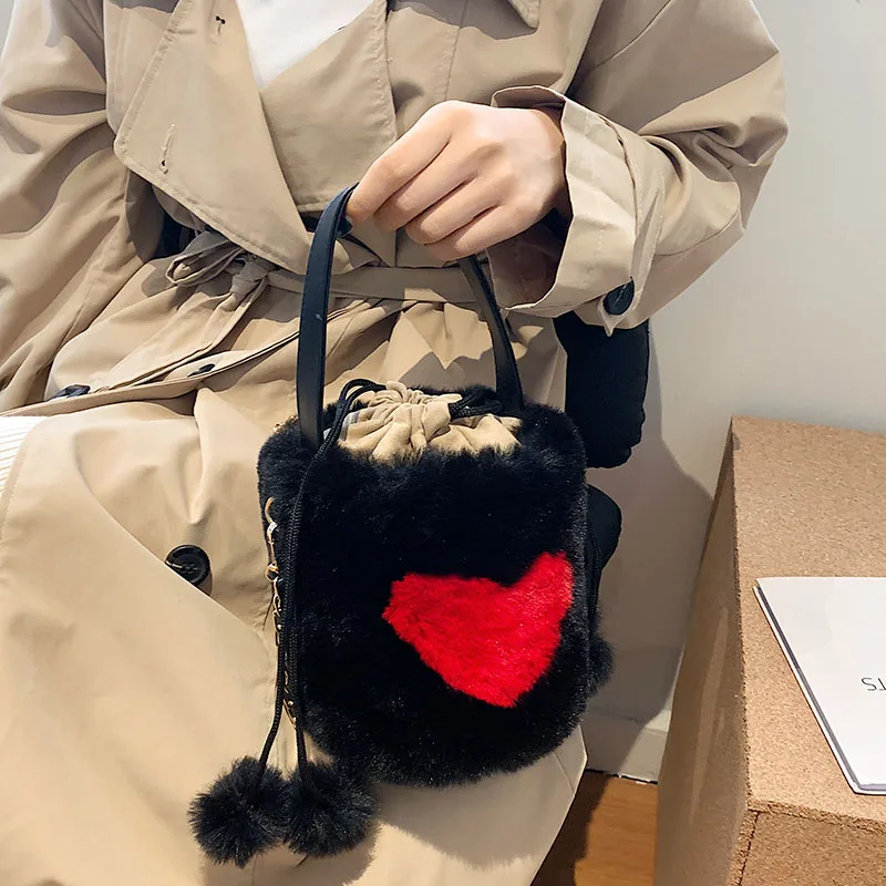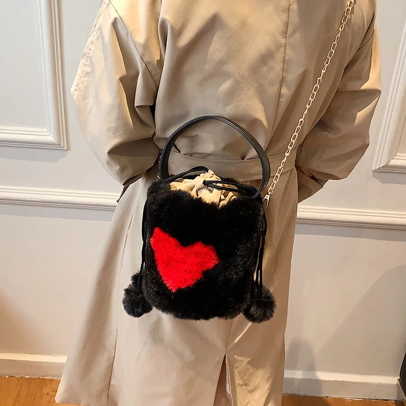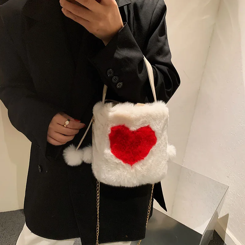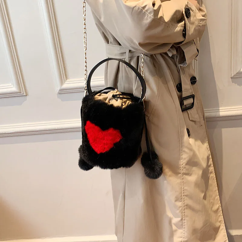 Плюшевые сумки-тоут с сердцем, мягкие пушистые сумки, меховые плечи, сумки-ведро, маленькая цепочка, пушистая роскошная дизайнерская сумка для женщин, зима 2021