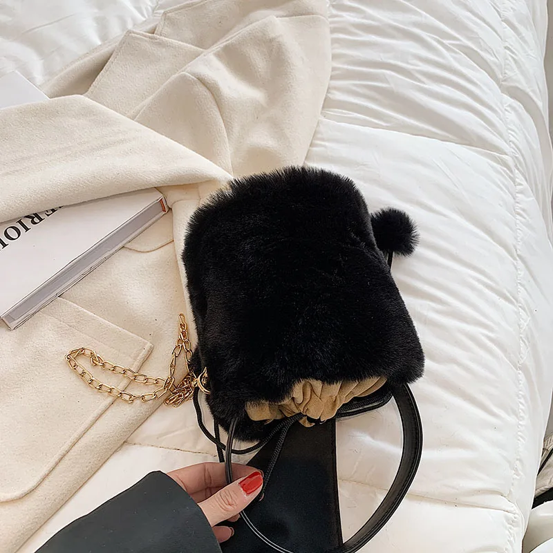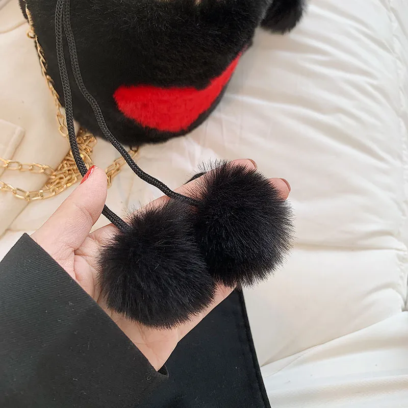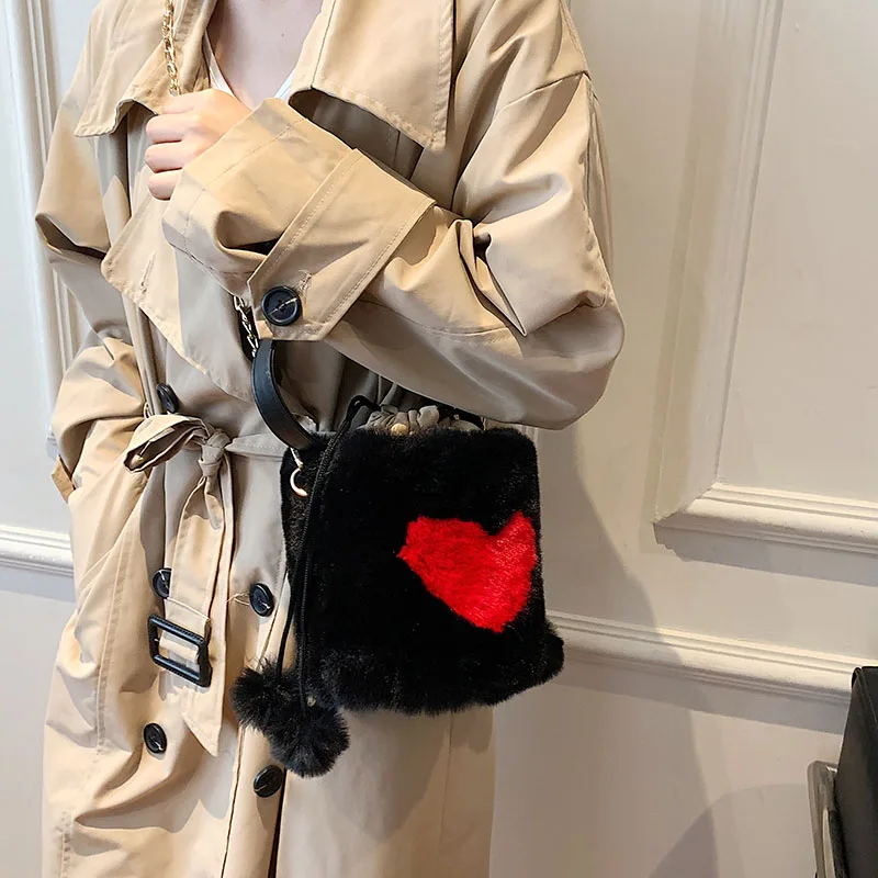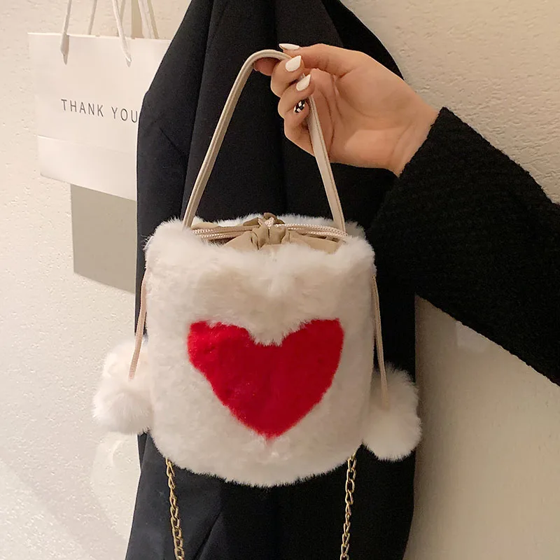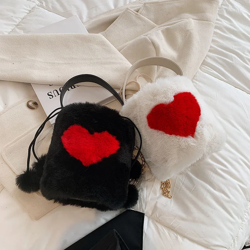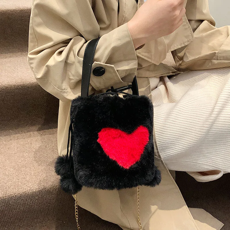 Плюшевые сумки-тоут с сердцем, мягкие пушистые сумки, меховые плечи, сумки-ведро, маленькая цепочка, пушистая роскошная дизайнерская сумка для женщин, зима 2021