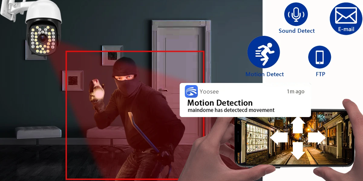 Реальное Push-уведомление в приложение телефона или отправить электронное письмо с фото или загрузить фото/видео на FTP сервер при обнаружении движения, он также поддерживает запись видео тревоги на sd-карту.