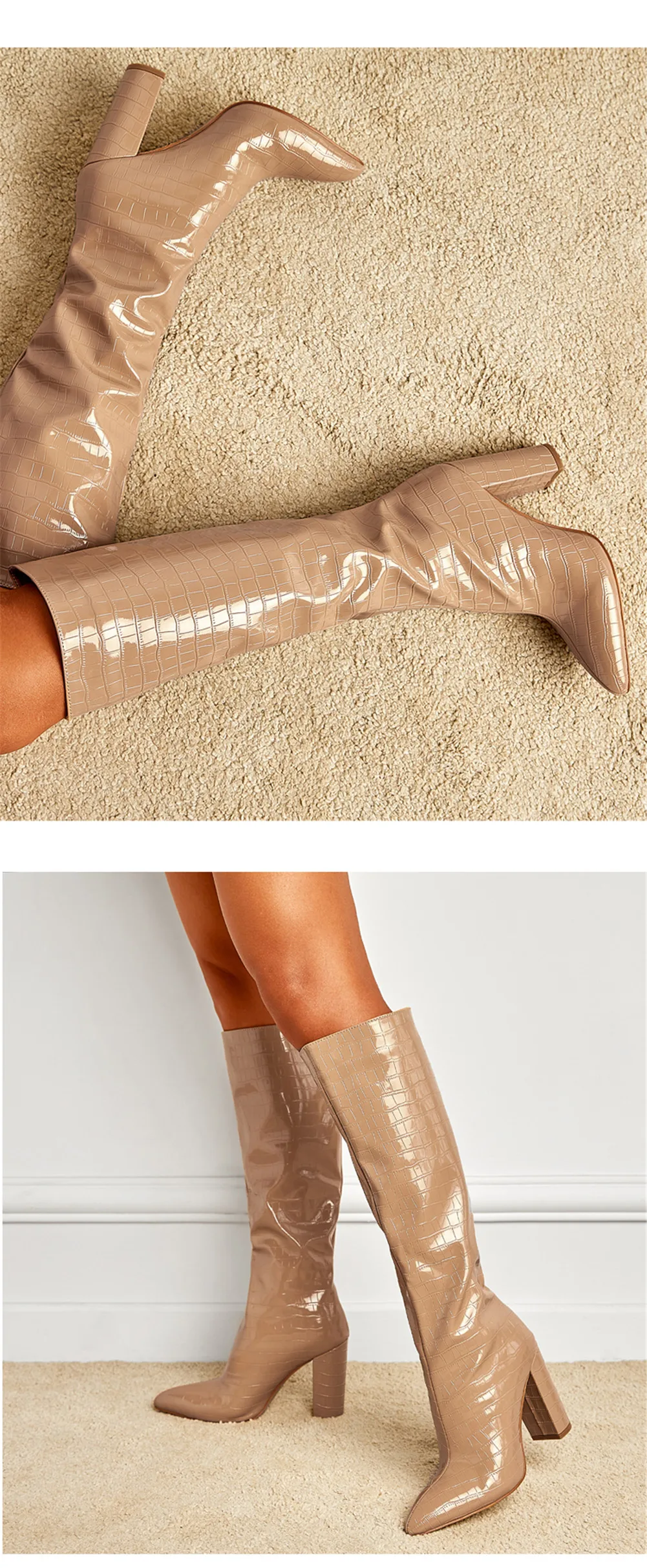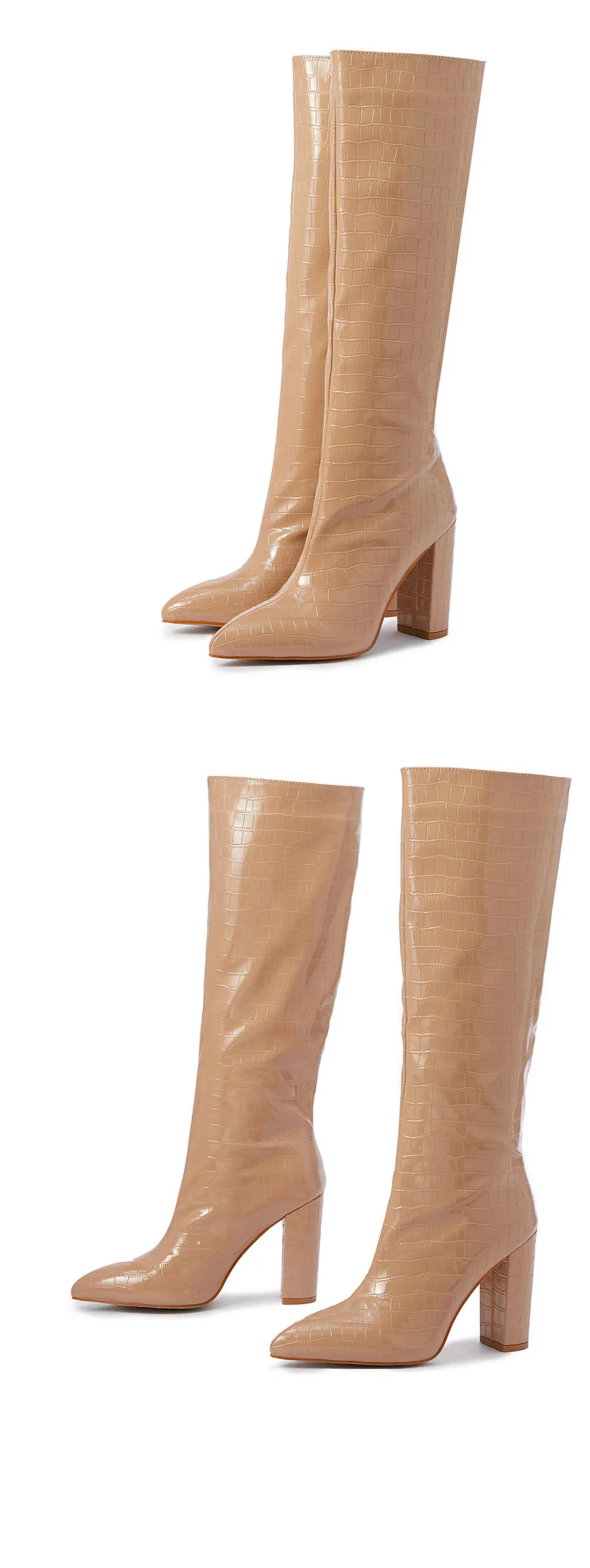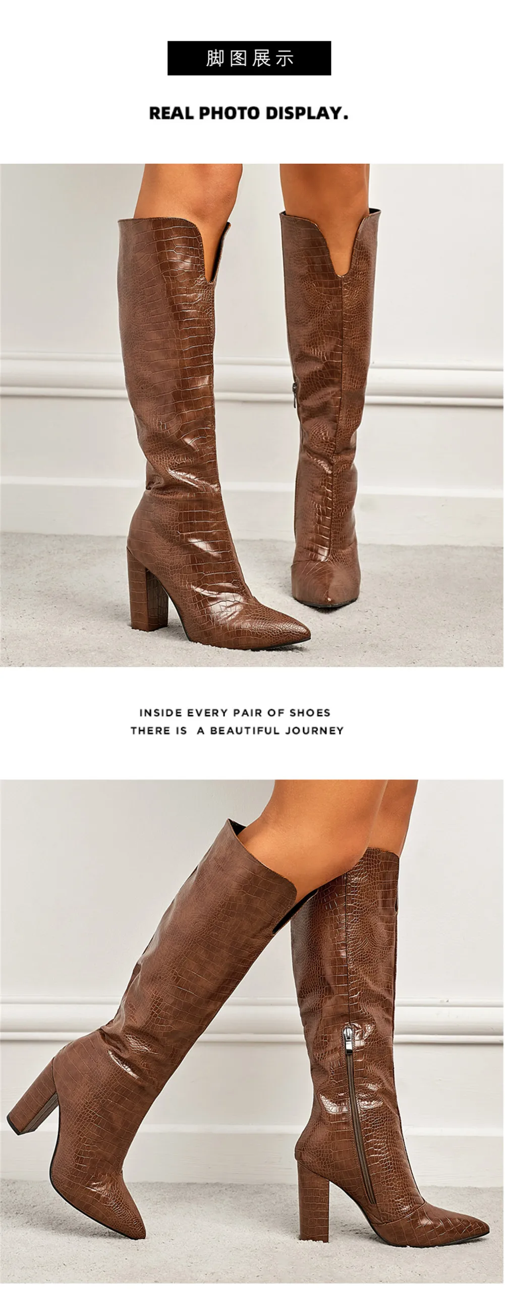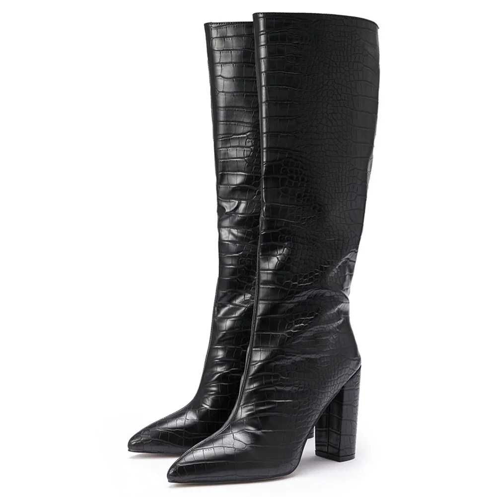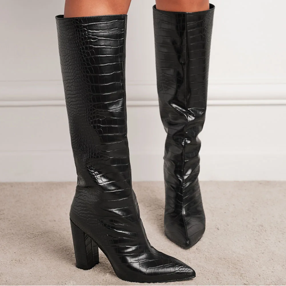 Женские ботинки на не сужающемся книзу массивном каблуке; Модные роскошные женские сапоги до колена с острым носком в западном стиле; Лидер продаж 2021 года