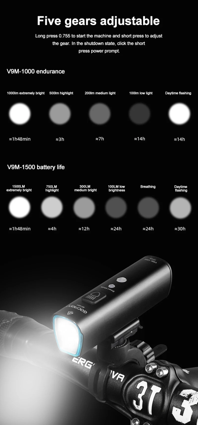 Высокая яркость, средняя яркость, низкая яркость, 5 режимов, высококачественный водонепроницаемый эффект