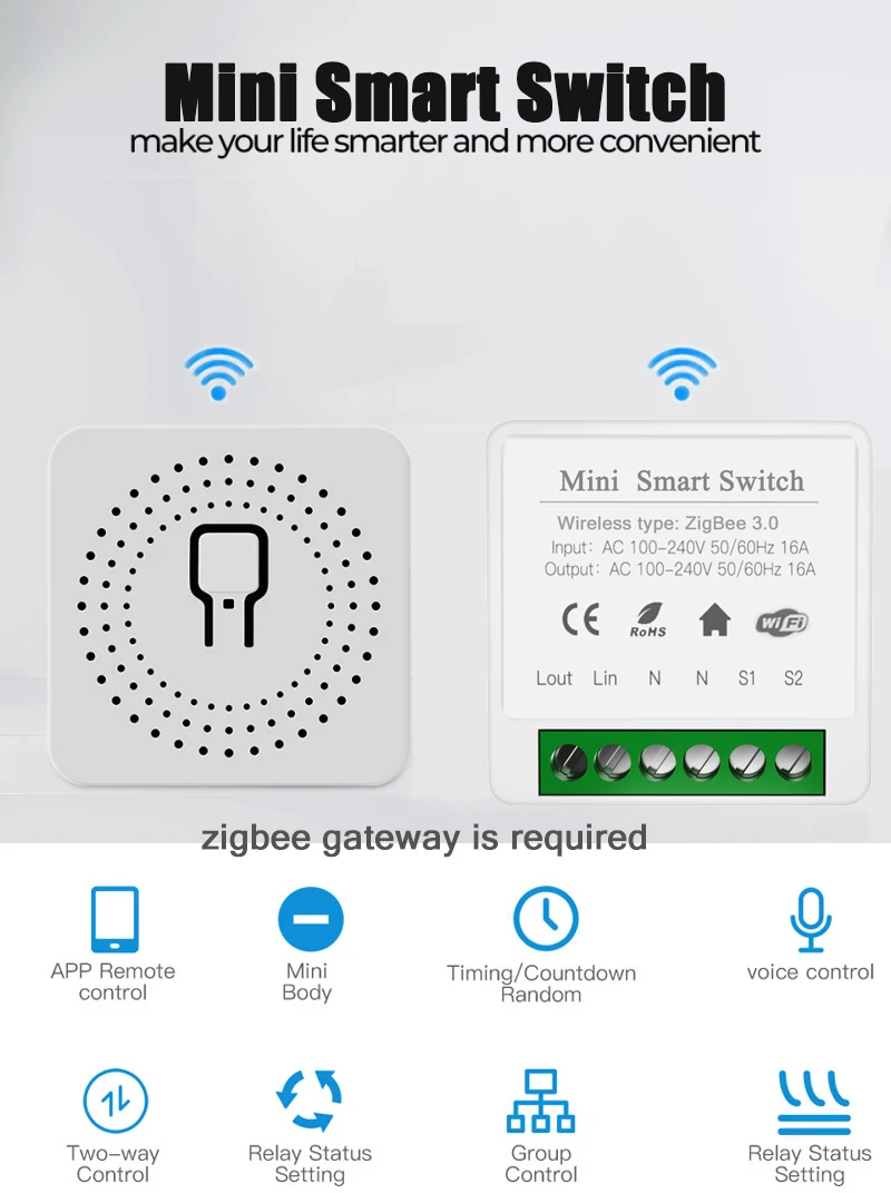 1. Умный мини-переключатель ZigBee разделен на 10A и 16A, 16A подходит для большего количества силового оборудования. Вы можете использовать смарт-переключатели на бытовую технику и светильник, чтобы вы могли включить или выключить устройство на свой мобильный телефон. Также могут быть созданы таймеры, Голосовое управление (Alexa, Google assistant, Siri) и смарт-сцены. Мини-фигурка может поместить смарт-переключатель в кассету, поэтому его не нужно размещать за лампочкой-светильник. Поддерживает три способа подключения, без переключателя/односторонний переключатель/двусторонний переключатель. (Требуется нейтральный провод)