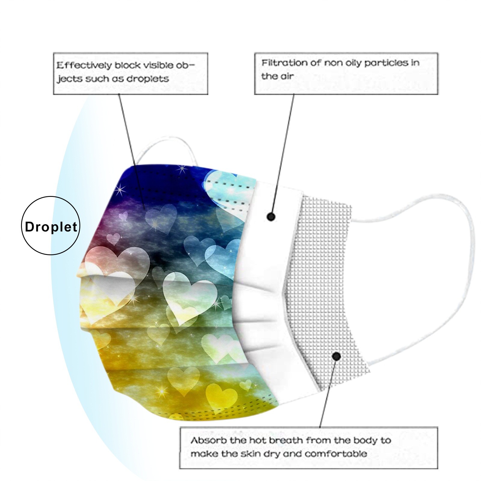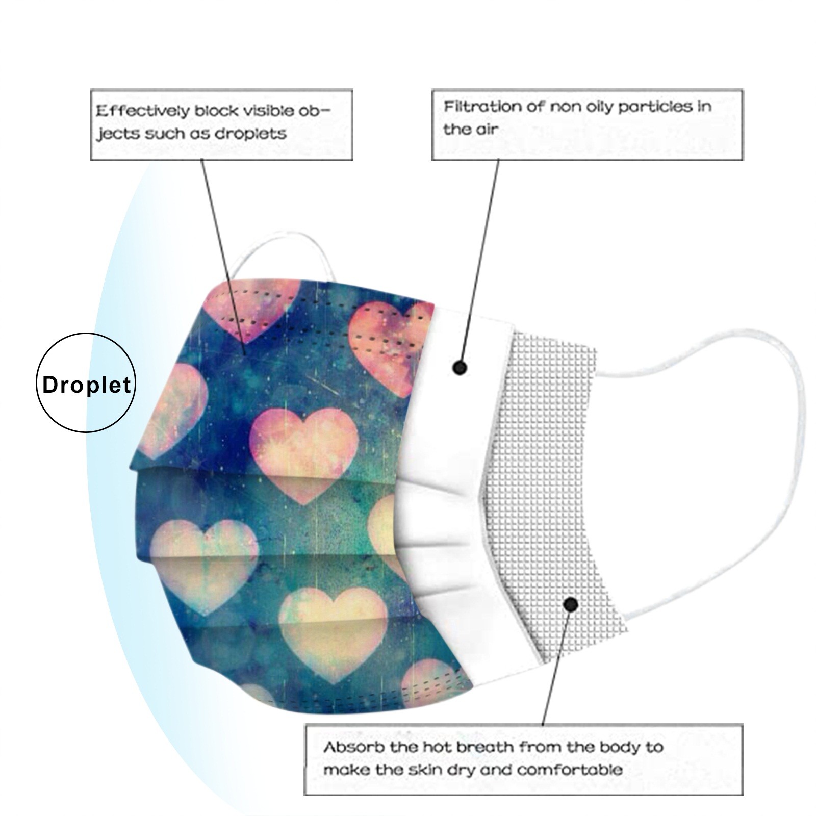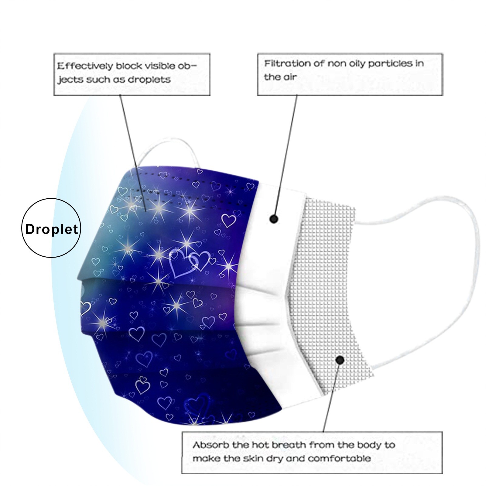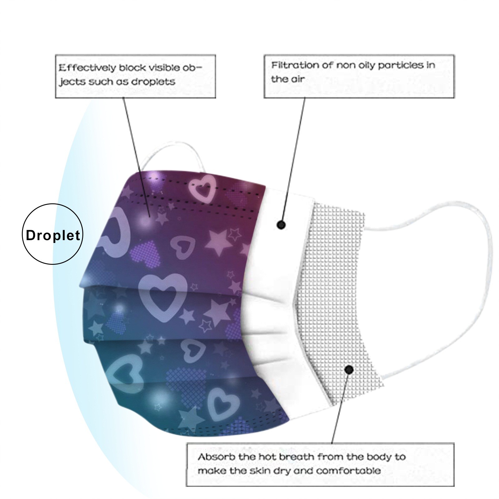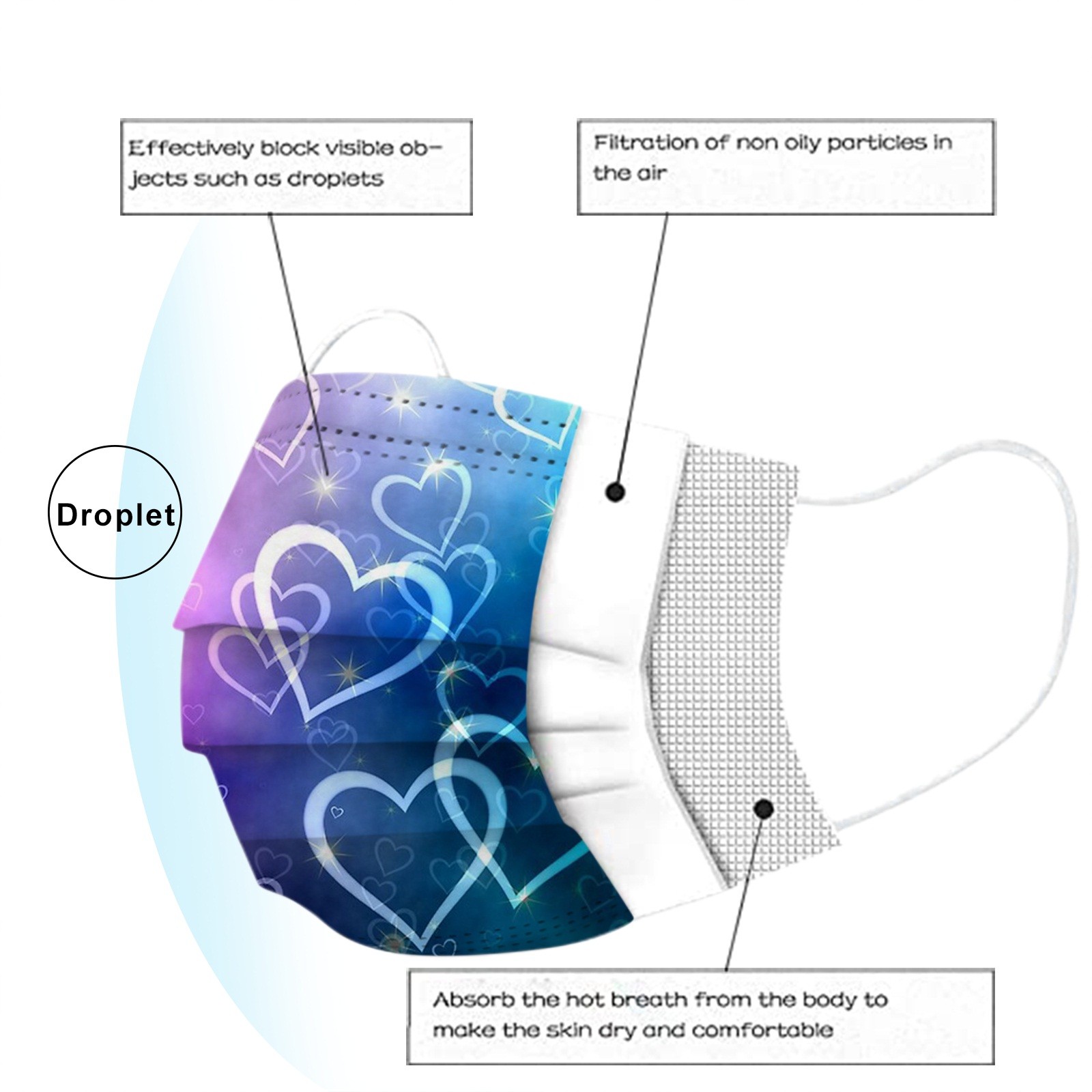 3 слоя Нетканая одноразовая маска изготовлена из 3 слоев нетканого материала, он безопасен для здоровья и безопасный для вас, чтобы использовать. Дышащий материал и милые узоры, что делает его полезным и модным. Специальный 3 слоя из нетканого материала, дизайн, обеспечивает некоторые меры защиты от пыли, автомобильный отходящий газ, пыльцу и т. Д. Эластичная петля уха позволяет легко снимать и надевать цепочку и не давит на уши. Маникюрный салон или любые другие области, где может потребоваться защита