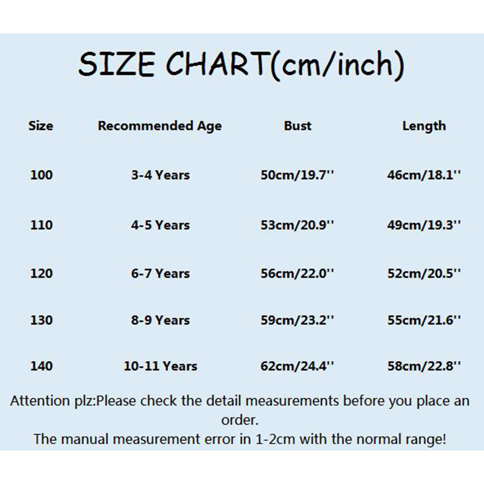 Размеры Рекомендуемый возраст Бюст Длина 100 От 3 до 4 лет 50 см/19,7'' 46 см/18,1'' 110 От 4 до 5 лет 53 см/20,9'' 49 см/19,3'' 120 От 6 до 7 лет 56 см/22,0'' 52 см/20,5'' 130 От 8 до 9 лет 59 см/23,2'' 55 см/21,6'' 140 От 10 до 11 лет 62 см/24,4'' 58 см/22,8''