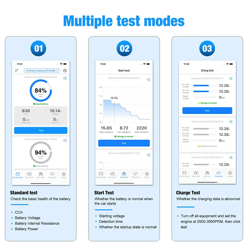 2. Наш синий t беспроводной автомобильный тестер батареи совместим со всеми 6 вольт и 12 вольт свинцово-кислотные батареи включают регулярные Затопленные, AGM плоские пластины, AGM спираль, гель, И аккумуляторы EFB с тестовым диапазоном (100-2000 CCA). Совместим с автомобилями, мотоциклами, грузовиками, RVs, квадроциклами, внедорожниками, лодками, яхтами, косилками и даже тележками для гольфа.