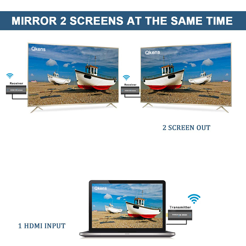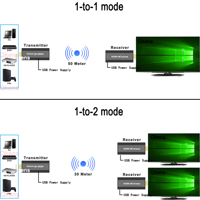 1. HDMI видео и аудио передача через беспроводной WIFI, до 50 метров в режиме от 1 до 1 в открытом пространстве;