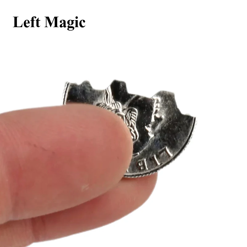 The magician shows a coin, then he bites the coin and removes a piece of the coin, the coin is clearly