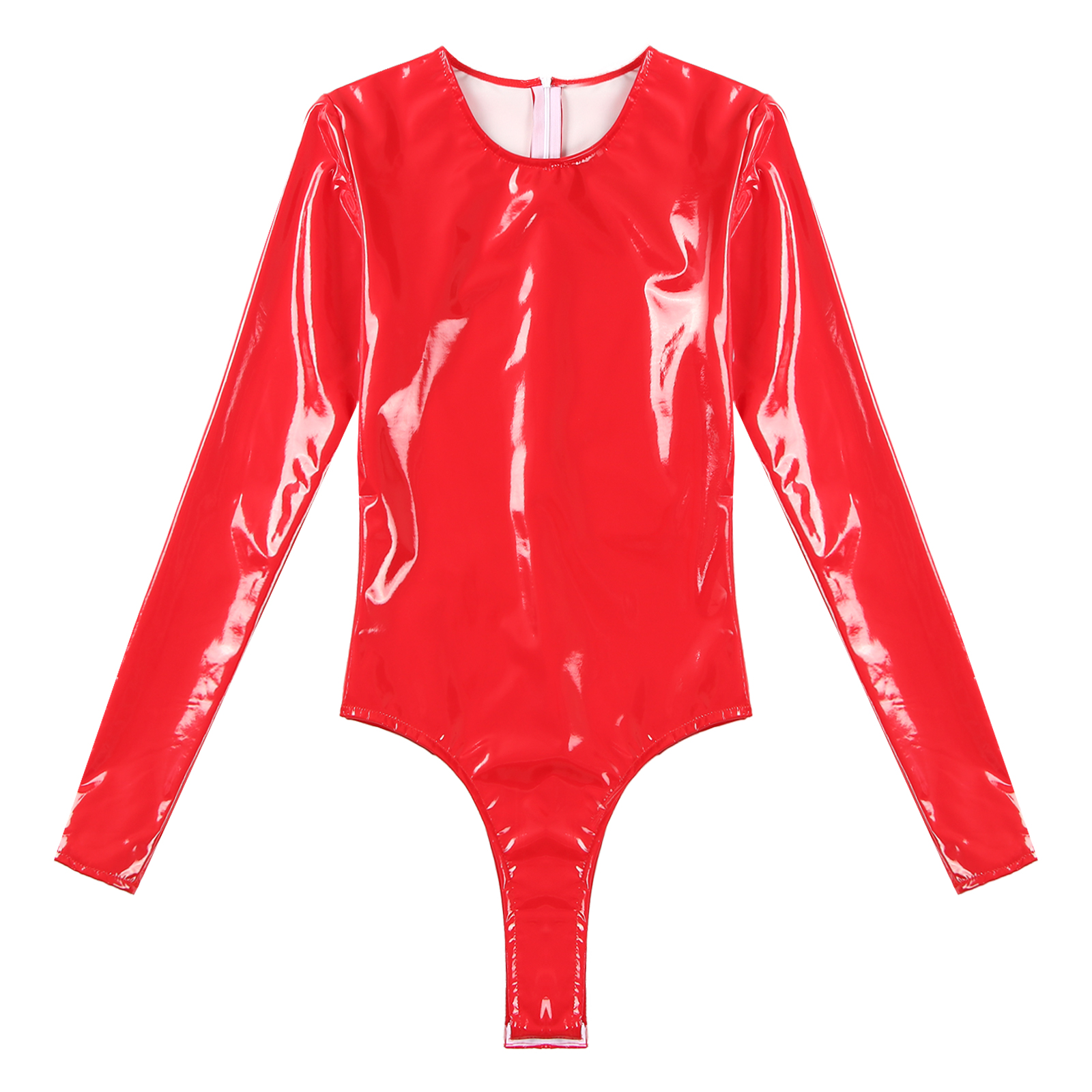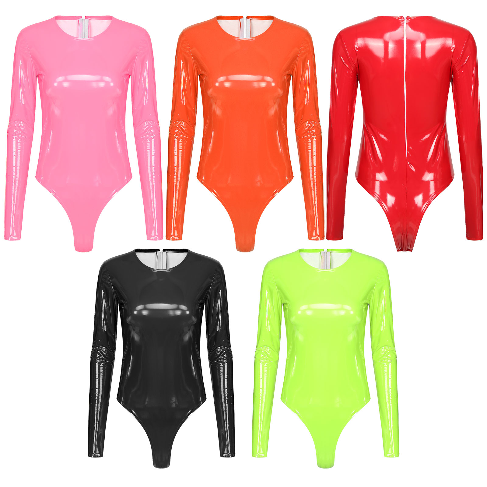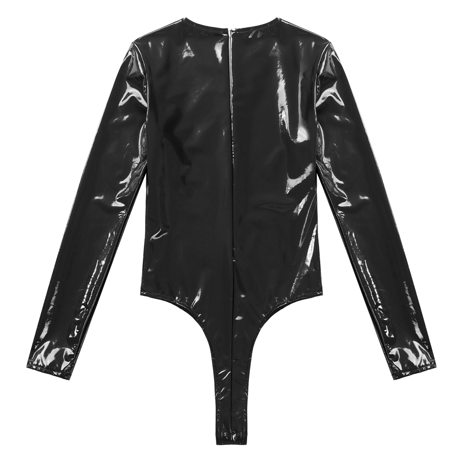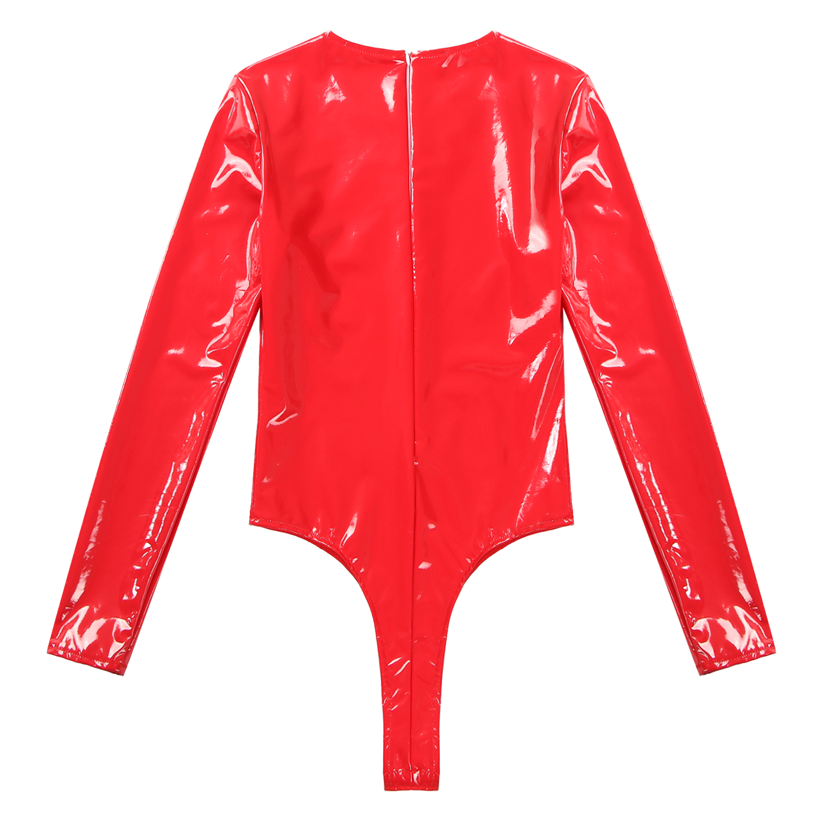Женский боди из лакированной кожи с длинными рукавами, трико с высоким вырезом и молнией сзади.