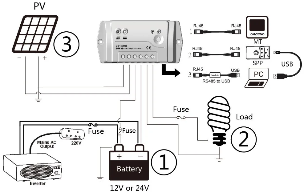 · 3 светодиода показывают зарядку PV, аккумулятор и состояние нагрузки
