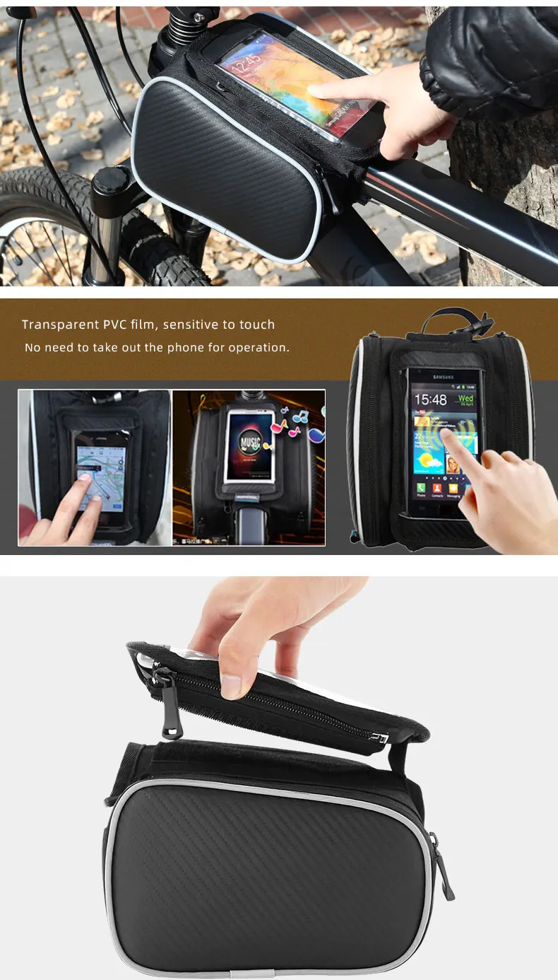 - Designed for bicycle top frame mount, with mobile phone pouch;