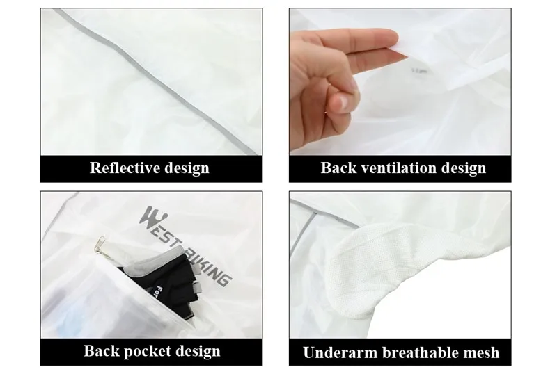 1. Чрезвычайно легкий/быстросохнущий/непромокаемый/ветрозащитный и УФ-защита. 2. Съемный головной убор и прочная открытая молния делают вас более удобными. 3. Эластичный дизайн манжеты, не допускайте проникновения холодного ветра во время езды. 4. Карманы с обеих сторон на молнии для хранения мелких предметов. 5. Светоотражающие полосы для безопасной езды в ночное время. Уникальный дизайн делает ваш велосипед более привлекательным.