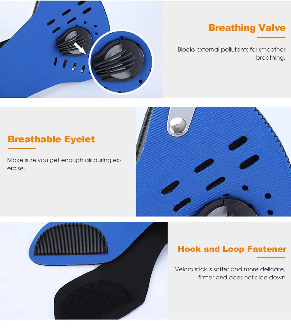 1. Activated Carbon Cycling Mask , 3 Layers of The Filter. 2. Breathable Sporting Fabric , Preventing Dust/Dirt. 3. Breathable Vents , Making Sure That You Could Get Enough Air. 4. Hook and Loop Fastener , Do Not Afraid Fail Down While Doing Sports.